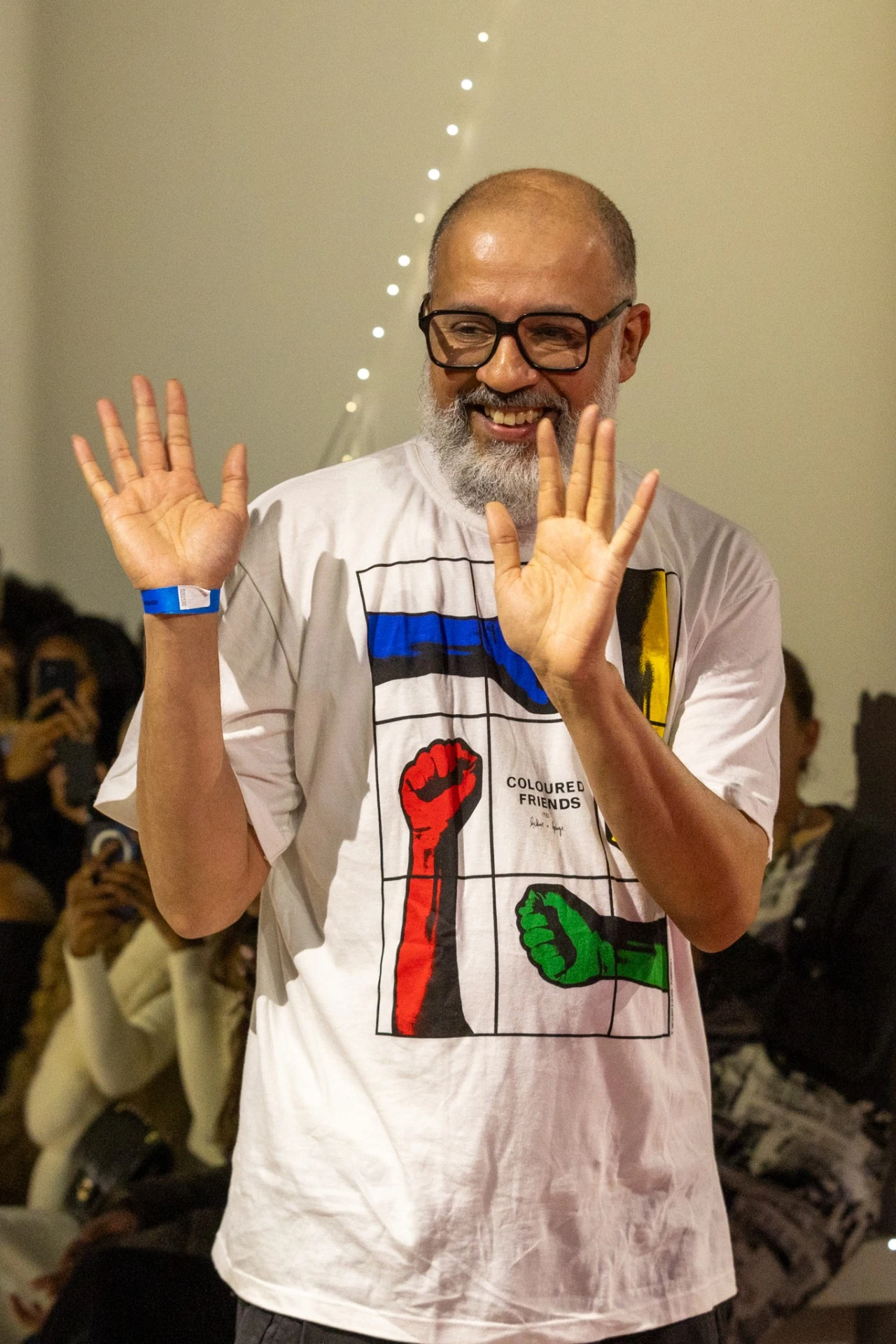 역시 쇼가 끝나고, 그는 유럽의 아트 듀오 ‘길버트 & 조지’의 그래픽 아트 <Coloured Friends >(1982)를 담은 빈티지 티셔츠를 입고 등장했다. 그에게 패션이란 이야기를 전하고 사회를 비추는 매체이며 세상에 대한 반응이기 때문이었으리라.