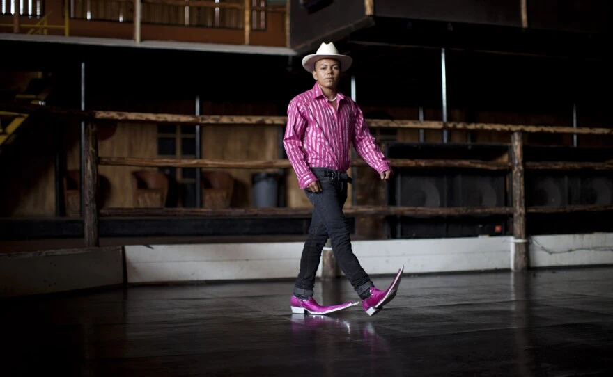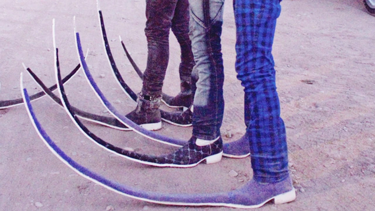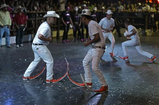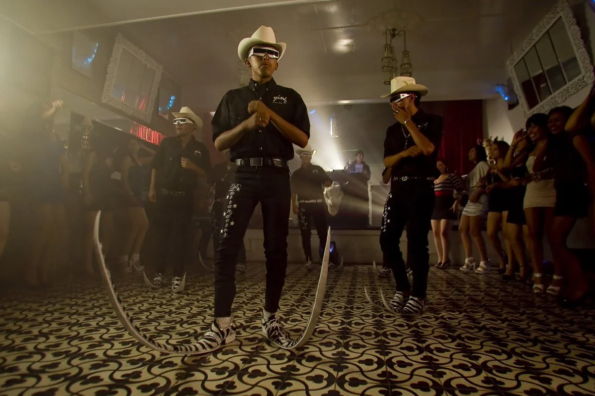 스키니 진을 입은 남자들은 멕시코의 전통 댄스 음악과 일렉트로닉 비트를 믹스한 Tribal 뮤직 아래에서 포인티 부츠의 비정상적으로 변주되어 뾰족하게 솟은 앞코를 자랑했다.