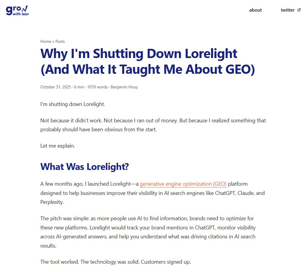 일주일 전, AI 검색 엔진의 노출 최적화(GEO)를 돕겠다던 회사 Lorelight의 창업자가 플랫폼의 서비스 종료를 알렸다. 그러면서 비즈니스 실패의 교훈을 공유했다.
