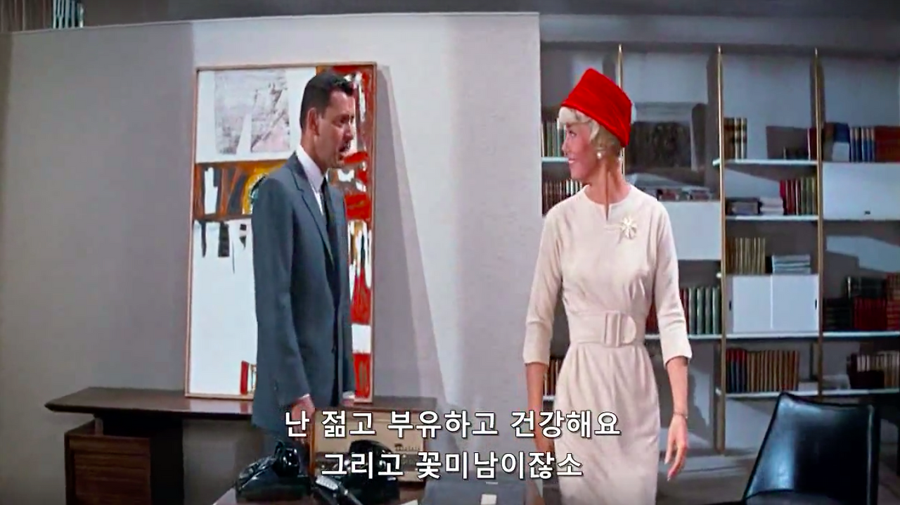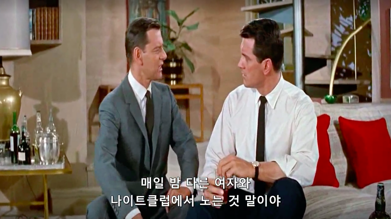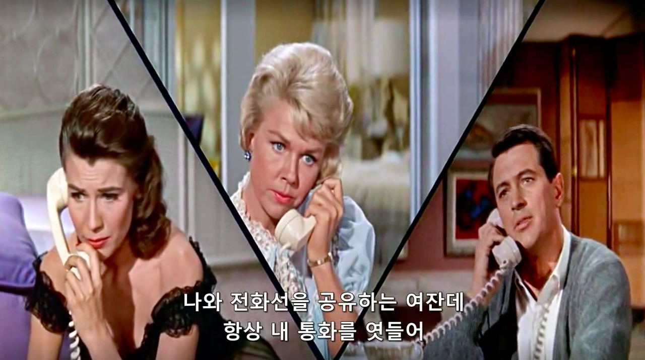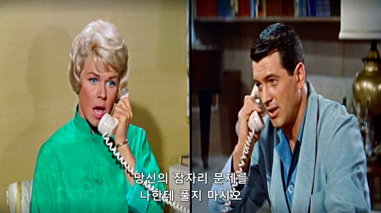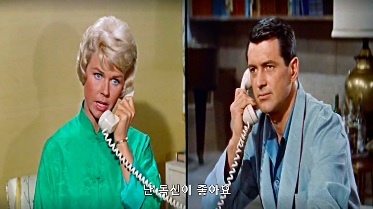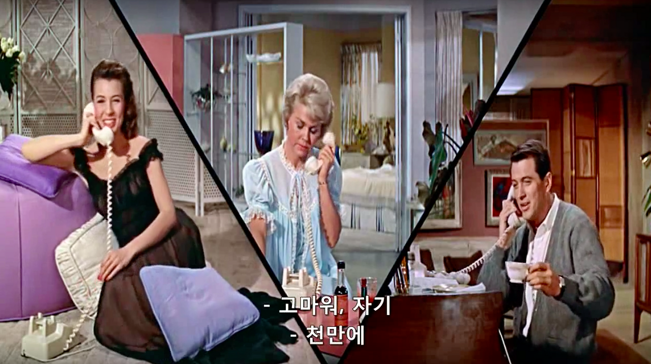 마이클 고든 감독의 1959년작, 영화 필로우 토크. 록 허드슨과 도리스 데이 그리고 토니 랜덜이 주연을 맡았다. 제임스 딘과 함께 당대 최고의 스타였다는 34살 록 허드슨의 진하게 잘생긴 외모와 굵직한 몸 그리고 50, 60년대 섹스 코미디 스타 도리스 데이의 세련된 스타일링과 새침함을 구경해 볼 수 있는 것이 포인트.