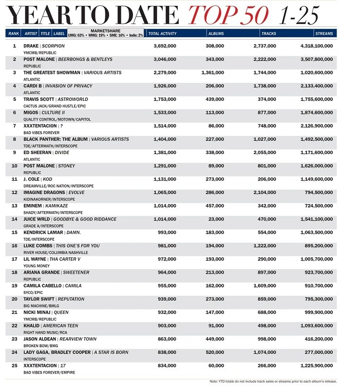 역시나 2018년의 탑 셀링 앨범의 약 80%가 힙합 프로젝트입니다. Atlantic Records에서 제작한 위대한 쇼맨의 컴필 앨범을 제외하곤 드레이크, 포스트 말론, 카디 비, 트래비스 스캇이 탑 파이브를 장악했네요. 아래 YEAR TO DATE TOP 50의 25위까지를 살펴보시죠. 힙합이...... 와...우...
