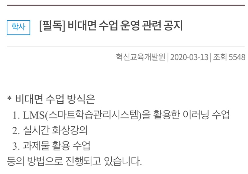 코로나19가 국내에 확산되기 시작할 쯤에는 바이러스의 치사율도 높았다. 그래서 우리 학교도 이에 대응하기 위해 ‘비대면 수업’을 통해 개강하기로 했다. 그리고 비대면 수업을 연장하다가 코로나19가 줄어들 기미가 보이지 않자 한 학기 모두 비대면 수업을 했다. 집에서 녹화된 강의나 줌을 이용한 실시간 강의로 수업을 들었다. 그렇게 내 대학교 1학년 1학기는 학교 한 번 가지 못해 보고 우리 집에서 종강을 맞이했다. 오죽 학교가 궁금했으면 학교를 보러 가려고 혼자 호텔을 잡고 학교 구경을 했을 정도다.