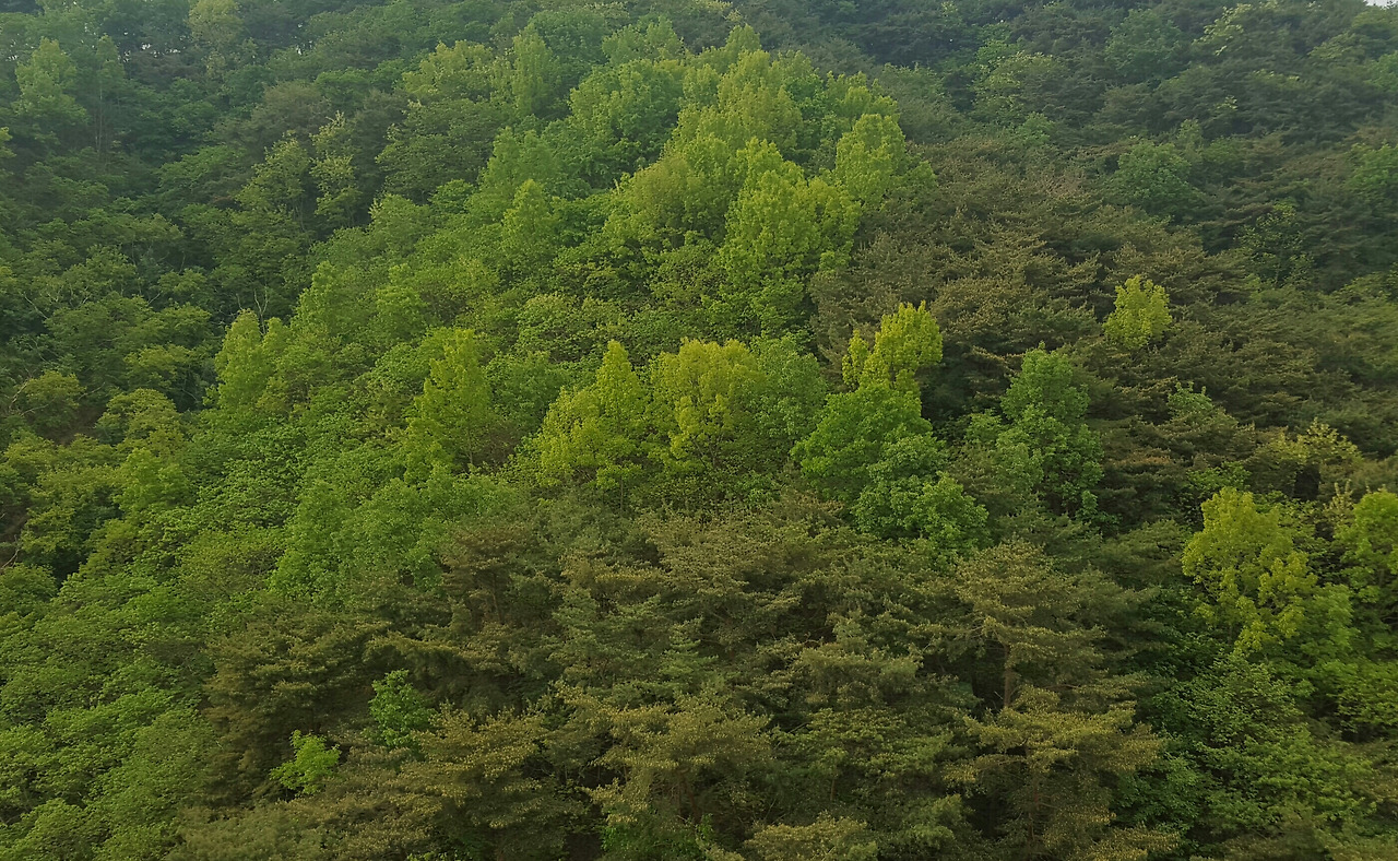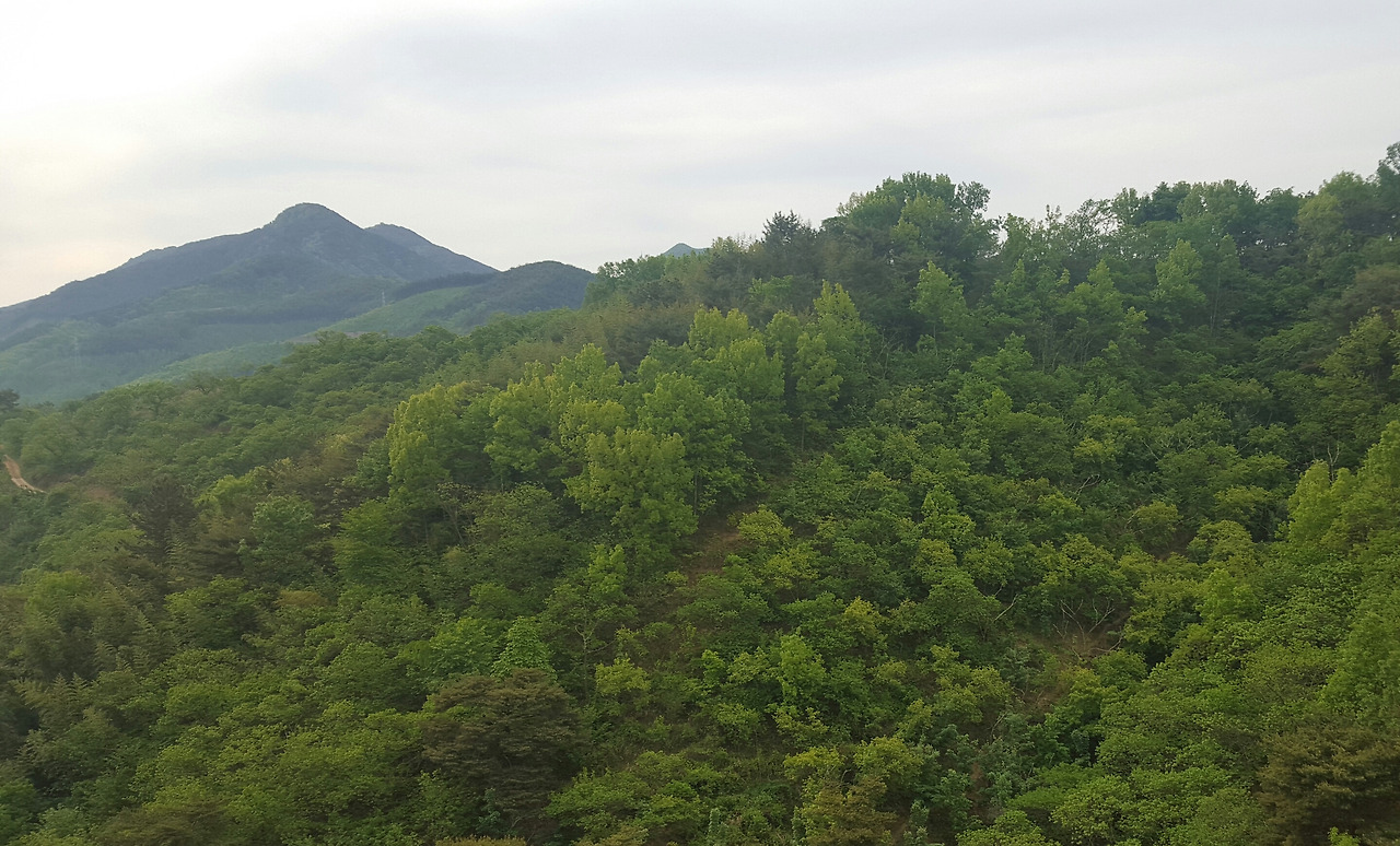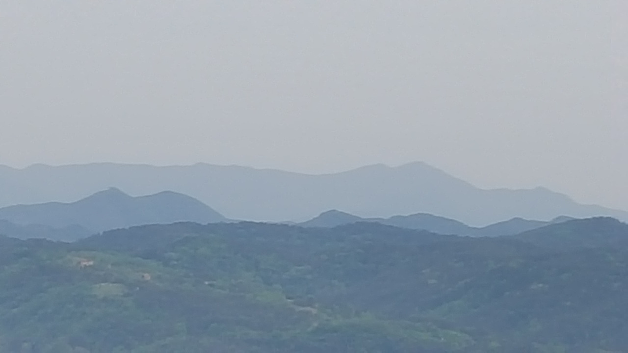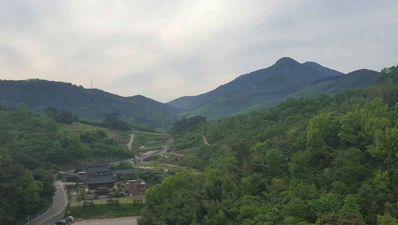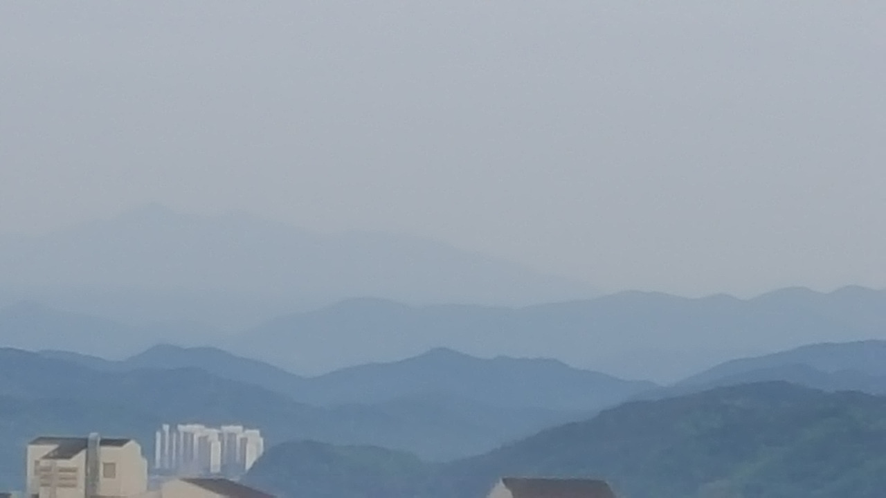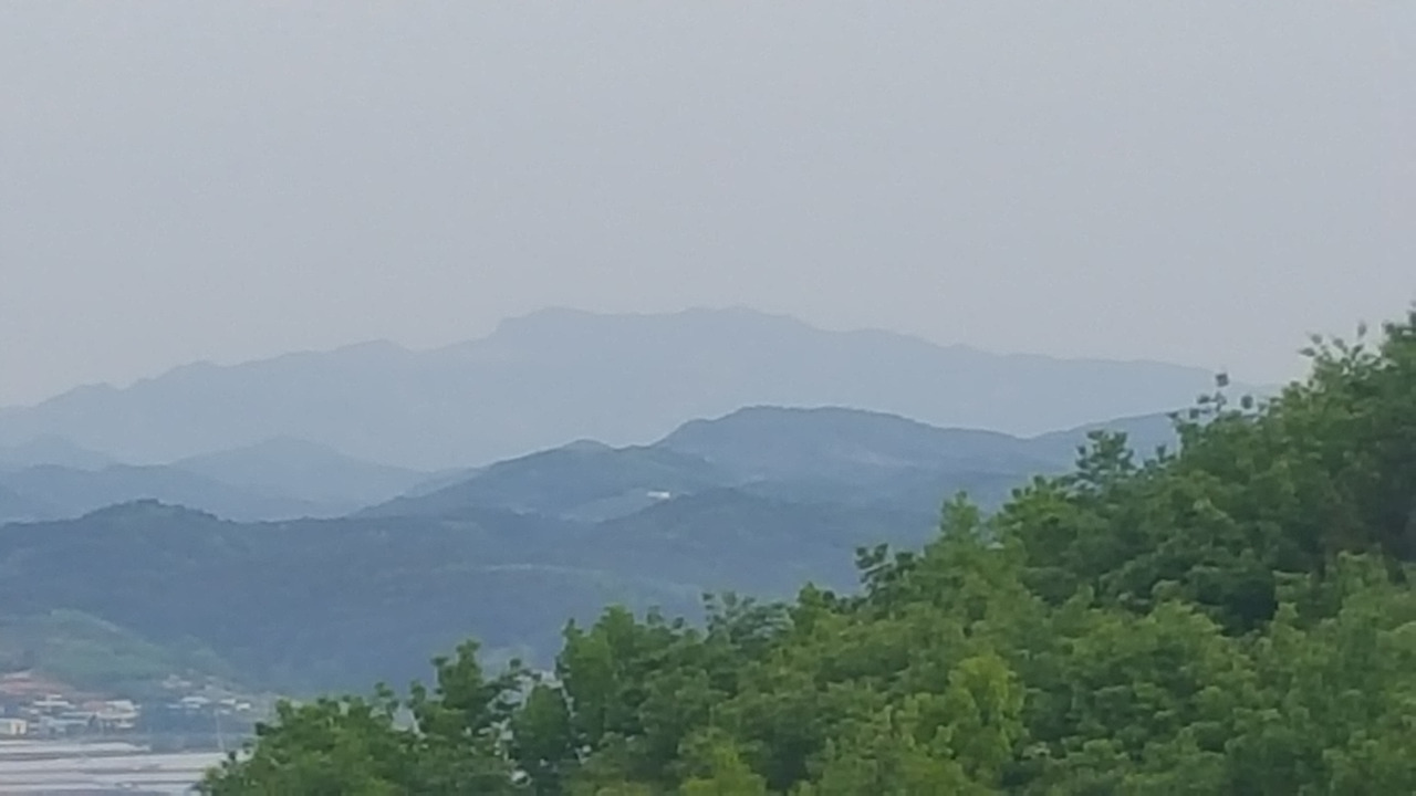 뒤 창 너머 저 멀리 천왕봉은 희미하다
