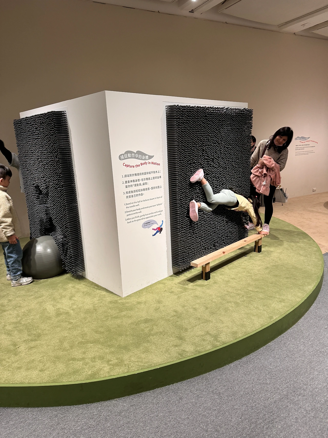 그 외 점토 체험, 그리기 체험 등 아이들이 할 수 있는 미술 활동들이 마련되어 있었다. 사실 언어가 통한다면 좀 더 잘 챙겨서 놀 수 있었을 것 같다. 곳곳에 안내해 주시는 분들이 계셔서 어떤 활동을 할 수 있는지 안내를 해주고 계셨기 때문이다. 그런 아쉬움을 가지고 더 둘러보는데, 역시 이곳은 무림의 피가 흐르는 땅인가 보다. 많은 플라스틱 핀이 있는 판을 눌러 다양한 모양을 만들어볼 수 있는 체험기구에서 한 친구가 아크로바틱 한 체험을 하고 있었다. 우리는 고작 손바닥 찍기, 등으로 눌러보기를 하고 있었는데, 우리 옆에선 물구나무 자세를 하고 몸의 모양을 찍고 있었다. 이럴 수가!