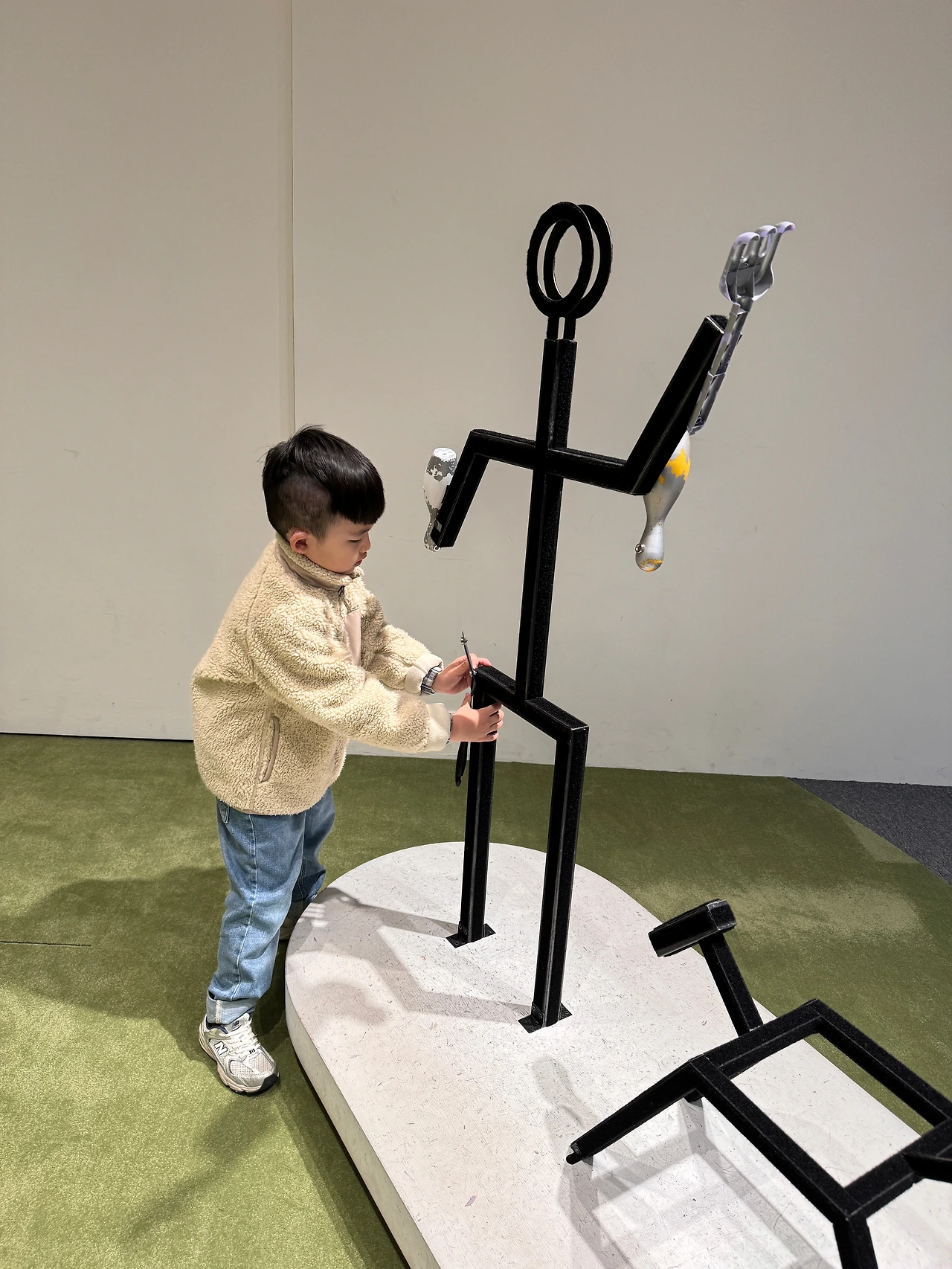 타이베이 시립 미술관을 간 이유는 어린이들이 미술 체험할 수 있는 공간이 있다는 얘기를 들어서였다. 이곳 역시 만 6세 미만이라고 하니 무료입장이 되었다. 한층 아래 위치한 어린이 미술관을 먼저 들렀다. 우리를 가장 먼저 반겨준 것은 거대한 사람 모형이 누워있는 공간으로, 아이들이 들어가서 무릎 산도 오르고 여기저기 매달려도 보고 담요 같은 것을 가져다 덮어주기도 했다. 그 옆에는 철로 만들어진 졸라맨 모형에 국자, 주걱, 볼링핀, 갈퀴 같은 것을 자석으로 붙여 나만의 작품을 만드는 곳이 있었다.