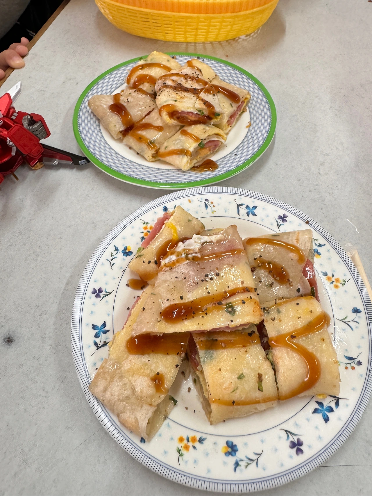 얇게 핀 전병 위에 아이가 좋아하는 치즈, 햄 등이 들어간 딴삥을 만난 순간, '이건 맛있겠다'는 생각이 들었다. 역시나 쫄깃한 전병피와 달콤한 소스, 짭조름한 햄의 조화가 좋았고 무엇보다 따뜻해서 더 맛있게 느껴진 것 같아.