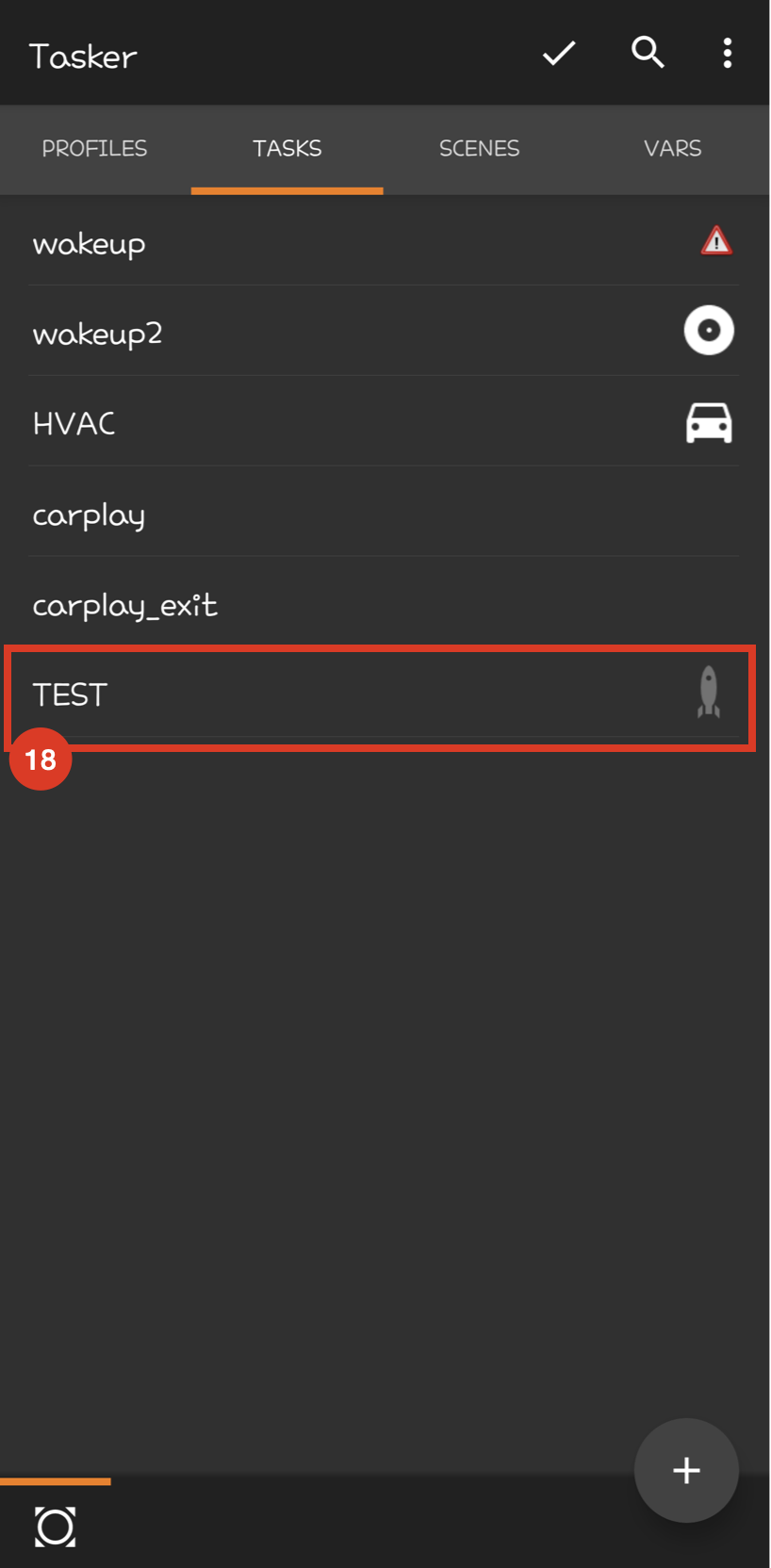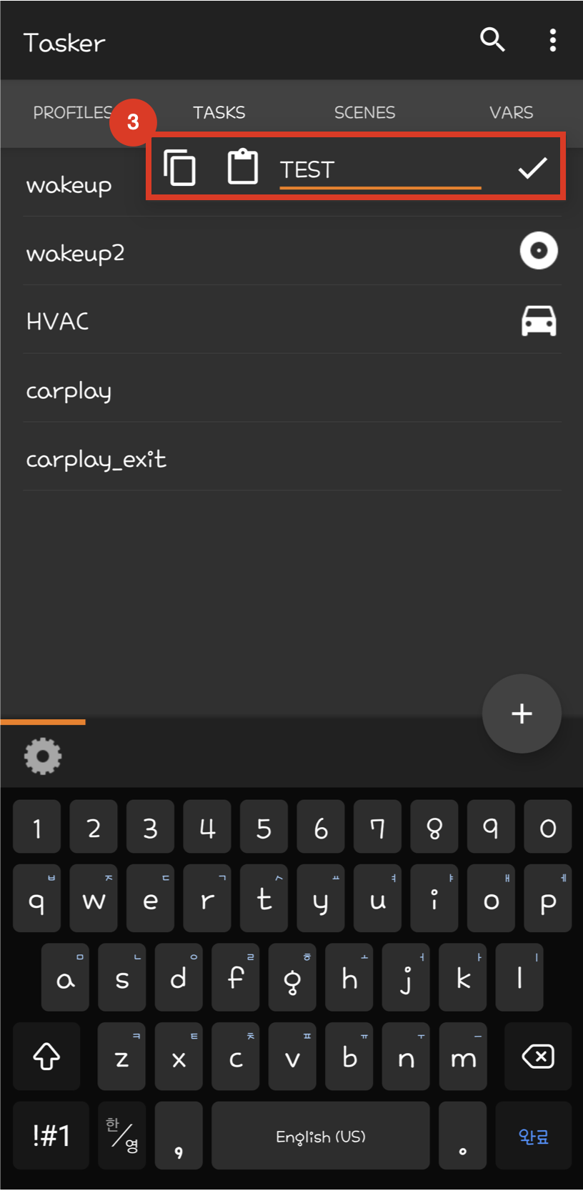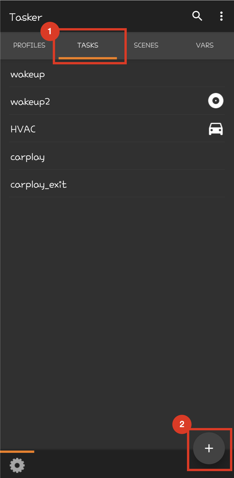 Tasker 앱을 실행한 후 (1) TASKS → (2) “+”를 누른다.