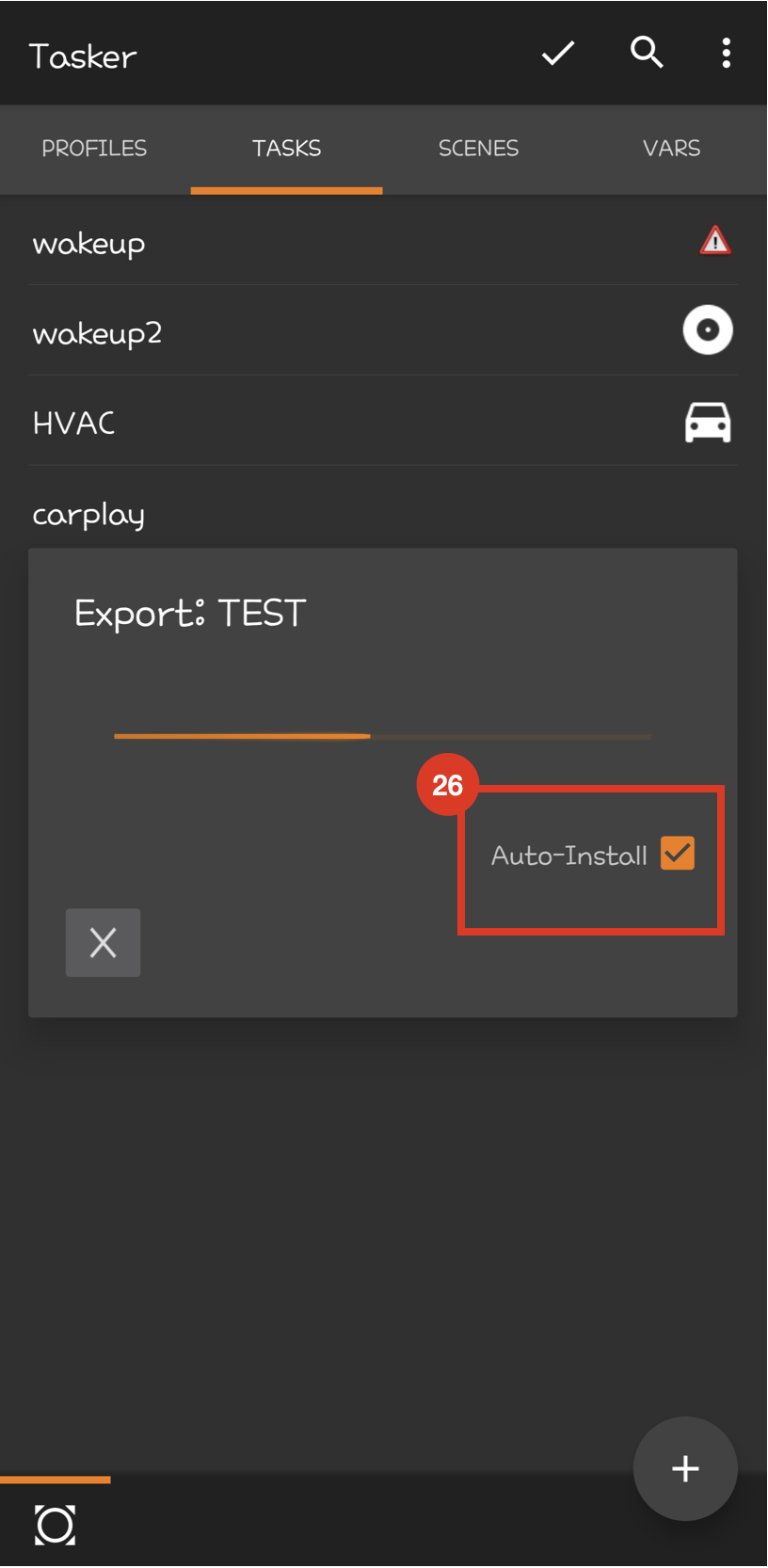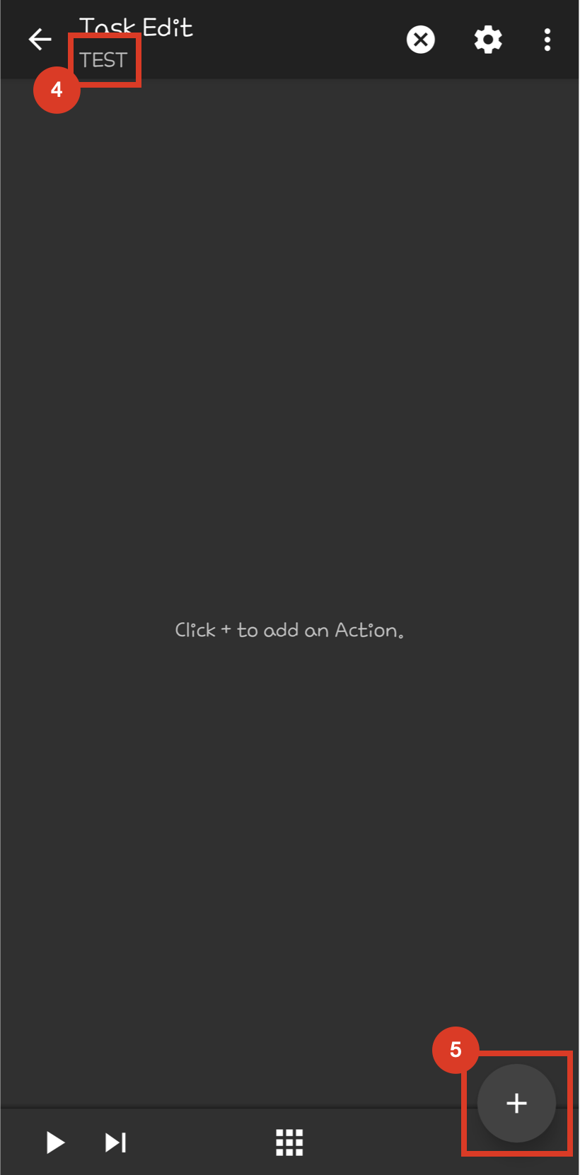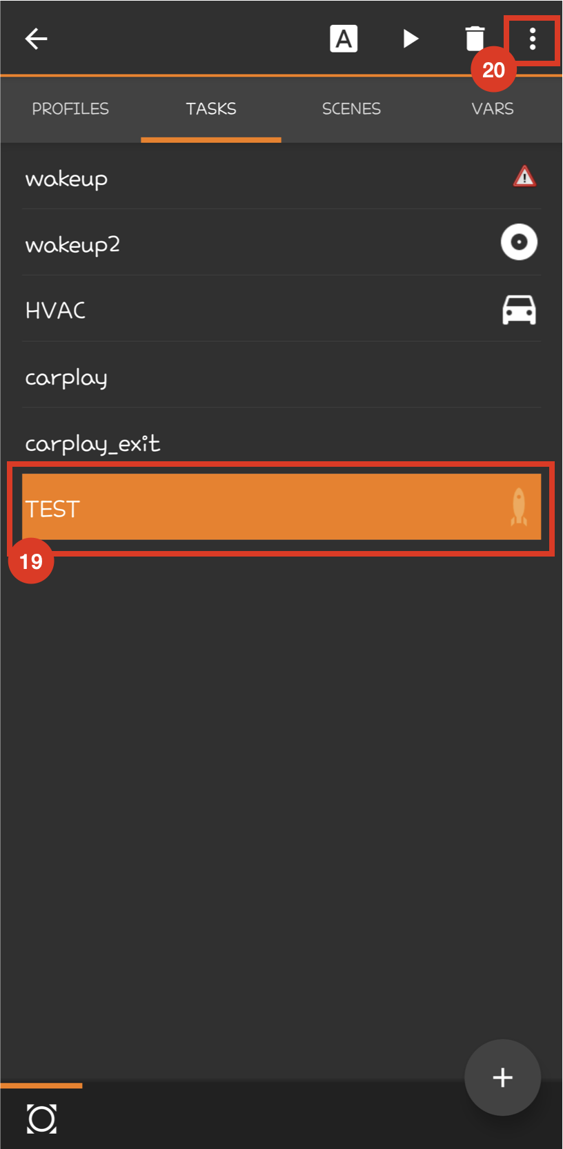 Tasker 앱을 실행한 후 (1) TASKS → (2) “+”를 누른다.