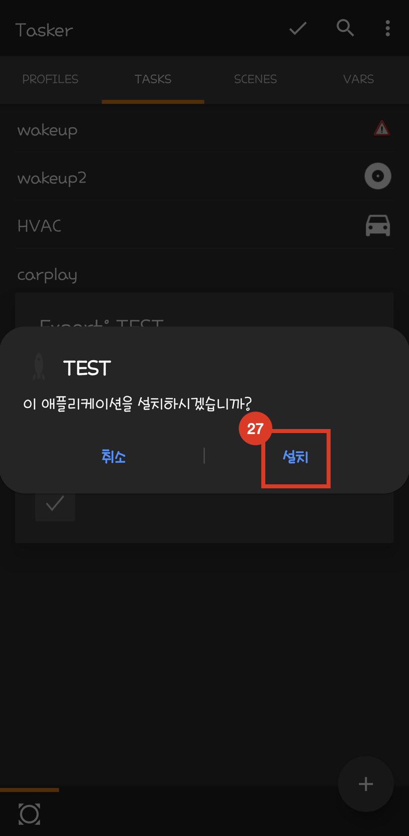 그러고 나서 (25) 뒤로 버튼을 누르고 다음 화면에서 (26)을 체크하자. 이때 에러가 날 수 있는데, 핸드폰 권한 문제가 대부분일 것이다. 이 핸드폰의 권한을 설정하고 나서 다시 위 작업을 실행하자. 그러고 나서 스무스하게 지나가면 (27) ‘설치’를 누른다.