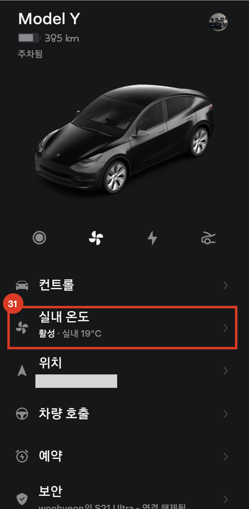 테슬라 공식앱으로 확인해보면 (31) 에어컨이 활성화된 것을 볼 수 있다.