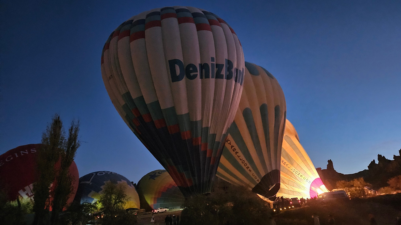 새벽 6시에 호텔을 나서니 아직 세상은 캄캄했고 공기는 차가웠다. 털모자와 목도리에 핫팩까지 챙기면서 추위에 대비했는데, 다행히 오늘은 바람이 잔잔해 열기구가 뜰 것 같다는 가이드의 말에 일행은 서서히 들뜬 표정을 지었다. 열기구 회사에서 제공한 차를 타고 30분 남짓 이동하자 어둠 속 들판에 거대한 천막처럼 누워 있는 열기구들이 모습을 드러냈다. 직원들이 바람을 불어넣자 천천히 숨을 들이켜듯 부풀어 오르더니, 어느새 괴물 같은 덩치를 갖추기 시작했다. 그 규모에 압도돼 바라보는데, 바구니가 세워지고 탑승하라는 안내가 들렸다.