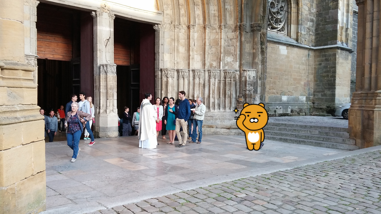 역 앞의 멕시코 식당에서 간단하게 저녁을 먹고, 시간을 보내기 위해 둘러볼 만한 곳을 찾느라 지도를 검색해 보니 역에서 정면으로 보이는 다리 건너편이 바욘시내인 듯했고 오른쪽으로 멀지 않은 위치에 그 도시의 성당이 있었다. 마침 일요일이어서 미사에 참석하기로 했다. 배낭을 맡길 곳이 없어 무거운 짐을 앞뒤로 짊어진 채 약 20분을 걸었다. 가는 길에, 역 앞에서 택시 합승을 제안했던 동양계 여성을 마주쳤다. 그녀는 대만 출신으로, 오늘은 이곳에 머물고 내일 생장피에드포르로 갈 예정이라고 했다. 이미 숙소에 짐을 풀었는지 가벼운 옷차림이었다. 잠깐이라도 말을 나눈 적이 있어 다시 만나니 반가웠다.