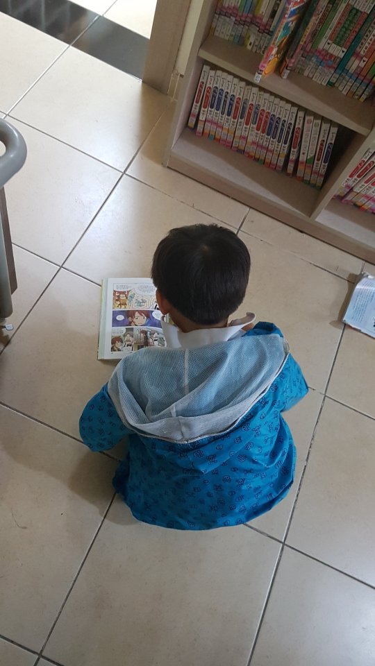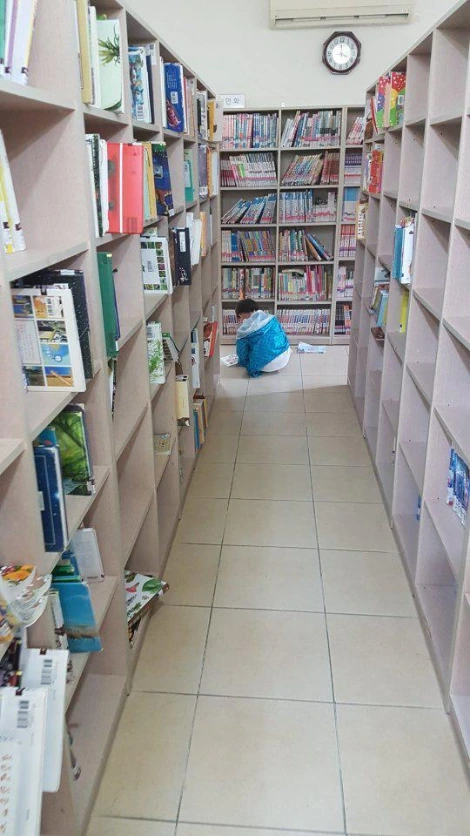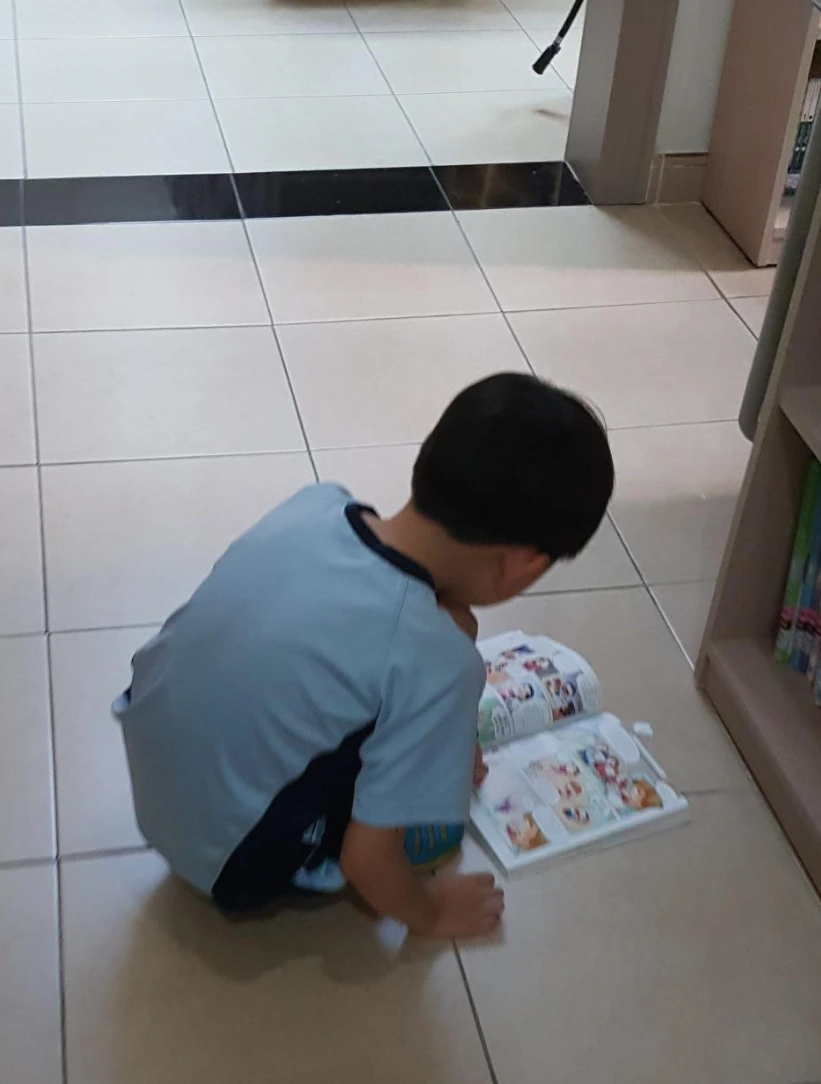 학교 수업 끝나고 나서도 내가 학교에서 회의가 있거나, 둘째 형아 하교 시간 맞춰서 같이 집에 가게 도서관에서 좀 기다리라고 하면, 저렇게 아무도 없는 도서관 구석에 쭈그리고 앉아 사람이 와도 모를 정도로 열심히 책을 보곤 한다.