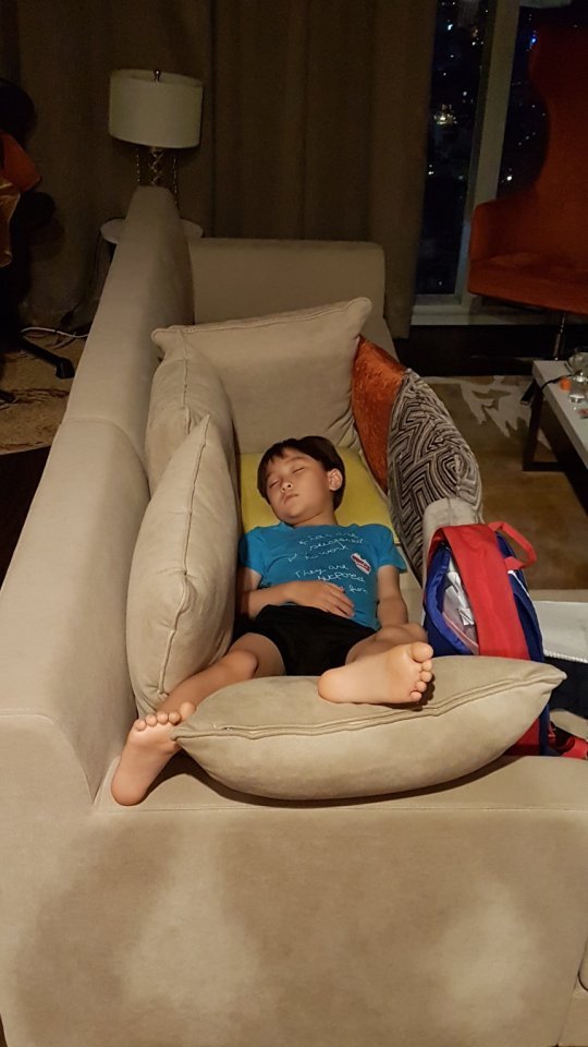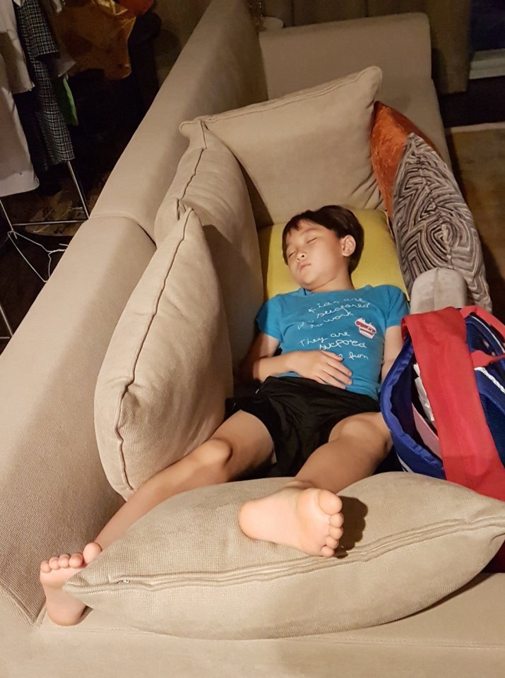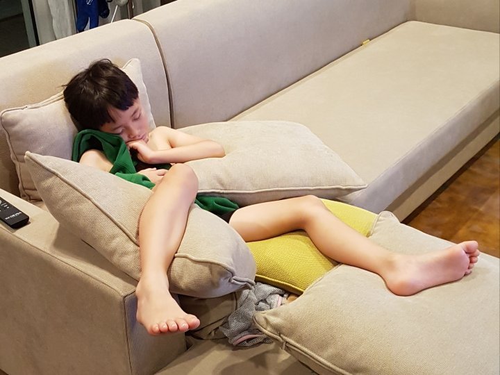 아빠 늦는다고 숙제해 놓고 먼저 자라고 하면, 침실로 안 가고 거실 소파에서 아빠를 기다리다가 저렇게 침대를 만들어 놓고는 자곤 한다.