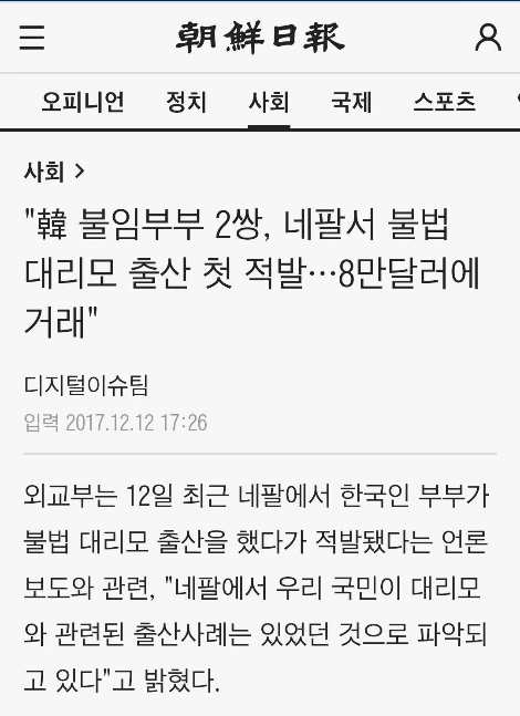 2017년 네팔에서 한국인 부부가 대리모를 통해 아이를 낳아 문제가 되었다고 보도가 된 적이 있다.