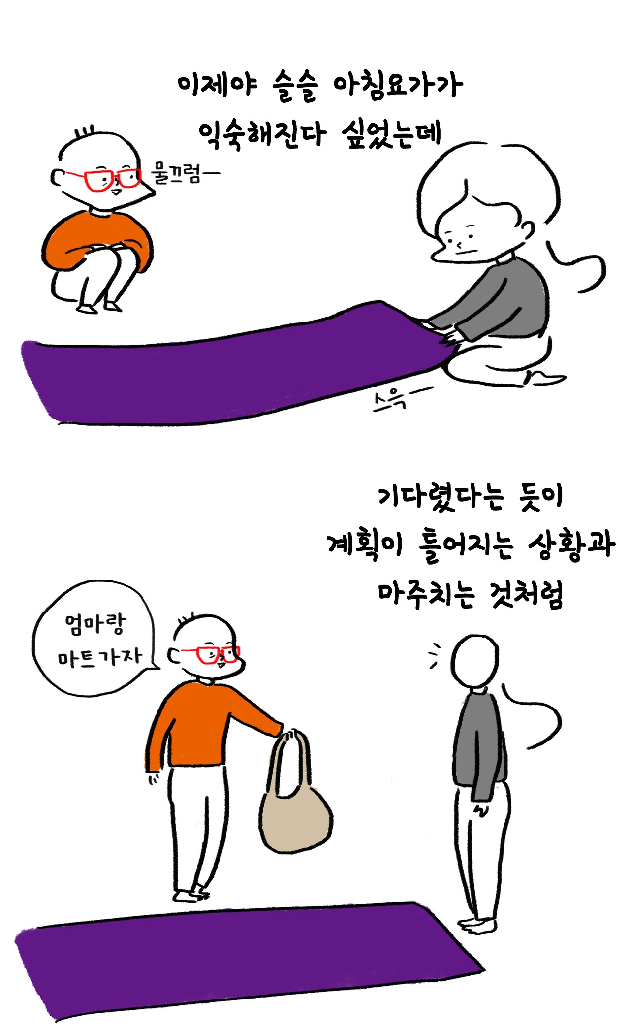 아침 요가가 하기 싫어서 몸이 베베 꼬일 때는 핑계도 없다가 이제 좀 해볼 만하니 변수가 생기는 게 약이 올랐다.