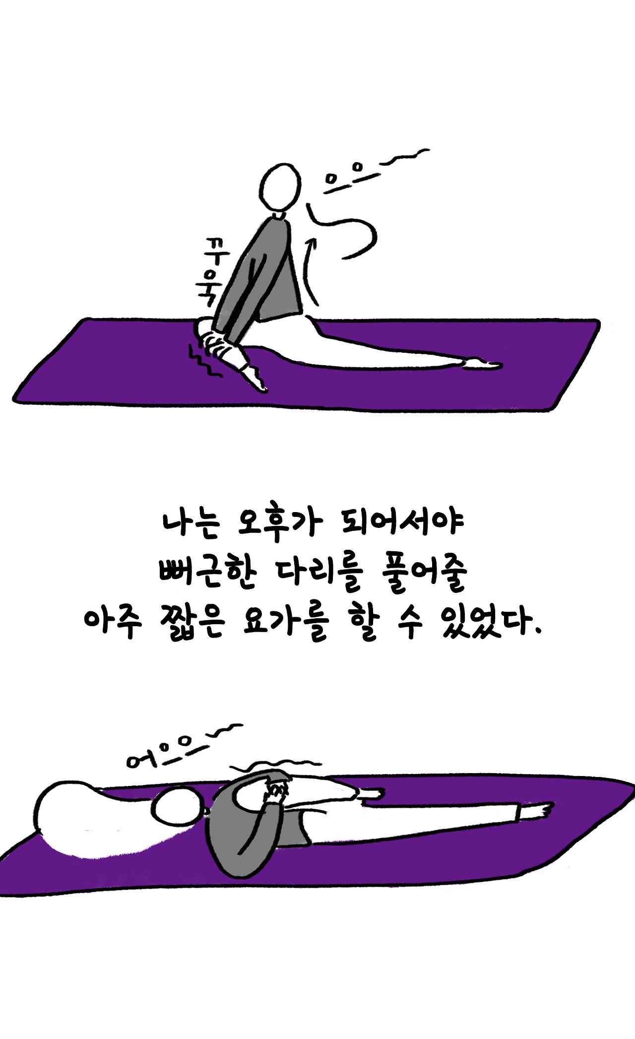 가장 뻐근한 다리를 풀기 위해 간단한 스트레칭을 시작했고, 그 요가는 평소보다 훨씬 시원했다.