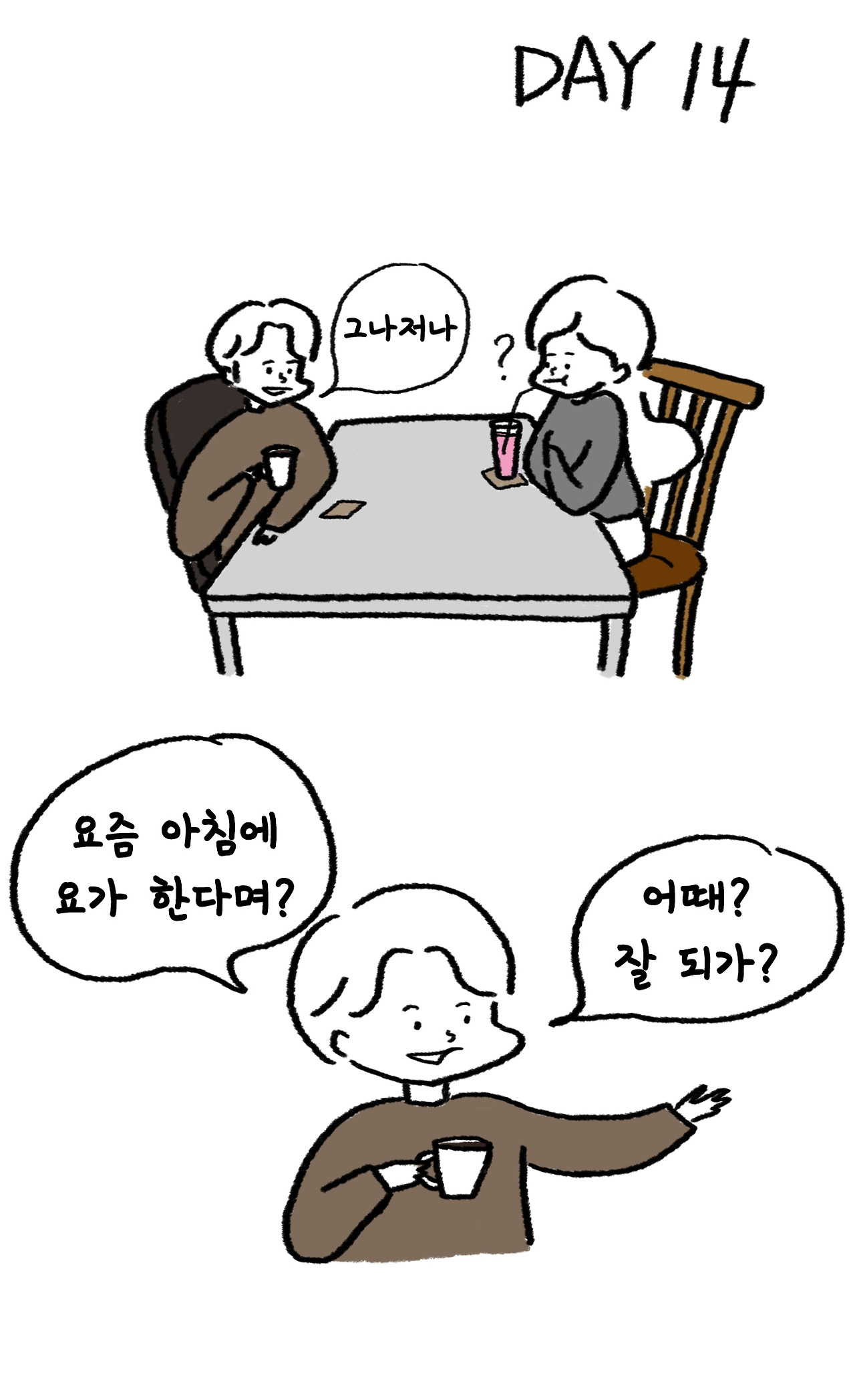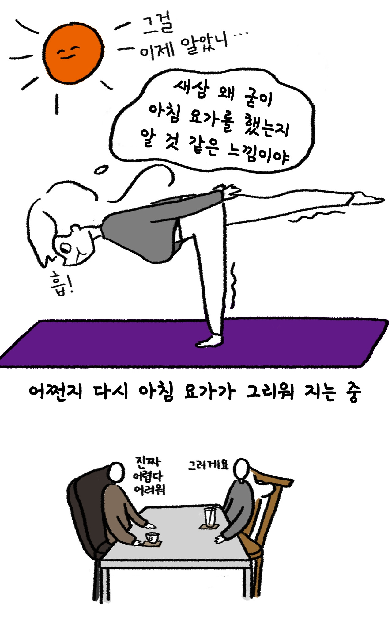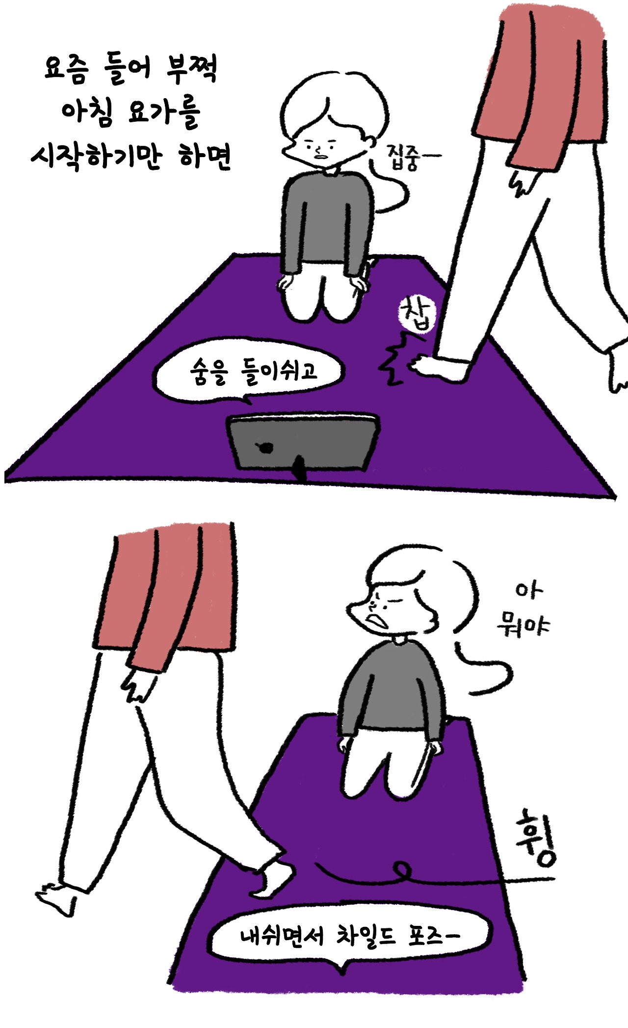 ‘우리 가족은 내가 요가매트를 펼치는 것만으로 이쪽에서 저쪽으로 꼭 넘어가야만 하는 이유가 생각나는 건 아닐까’