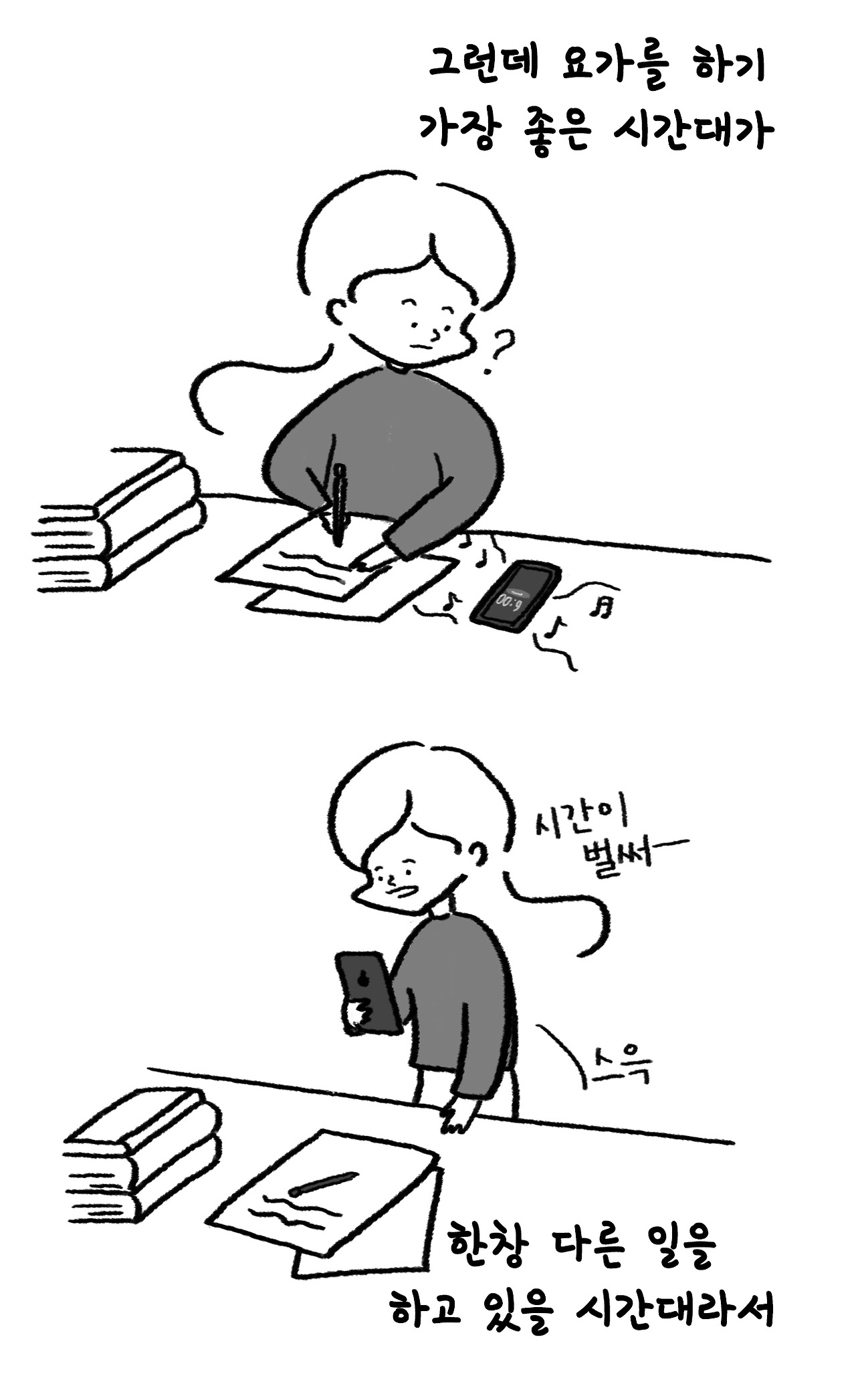 요가뿐 아니라 다른 일을 하기에도 너무나 좋은 환경이었으며, 저녁으로 옮긴 요가 시간은 한창 일 하기에도 좋은 시간대였다는 것을.