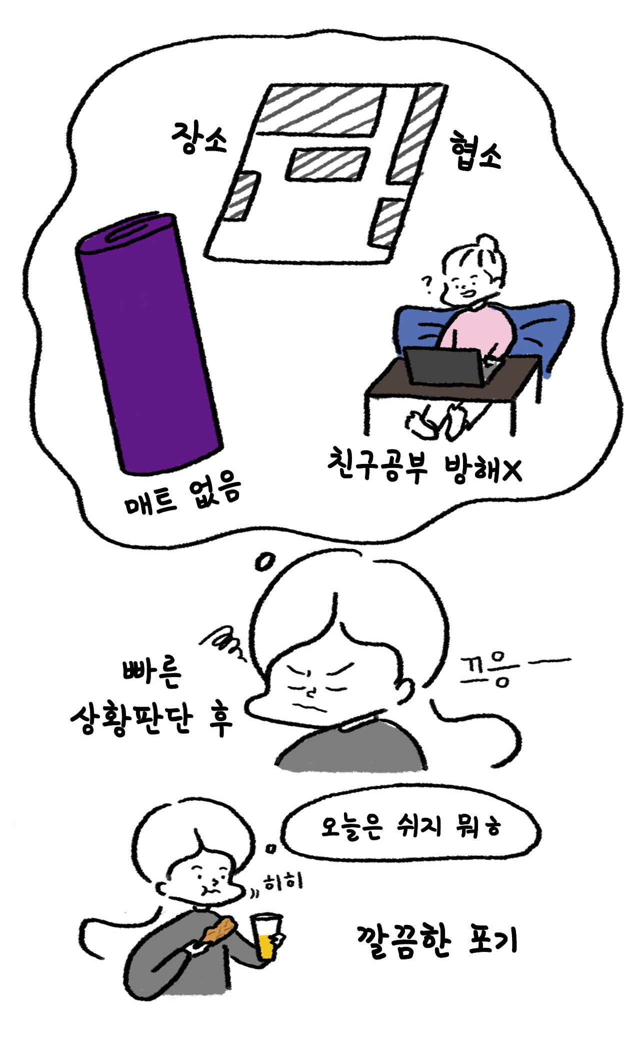 문득 집이 아닌 다른 곳에서 요가를 해야 한다는 사실을 깨달은 건 친구와 저녁으로 치킨을 뜯고 있을 때였다.