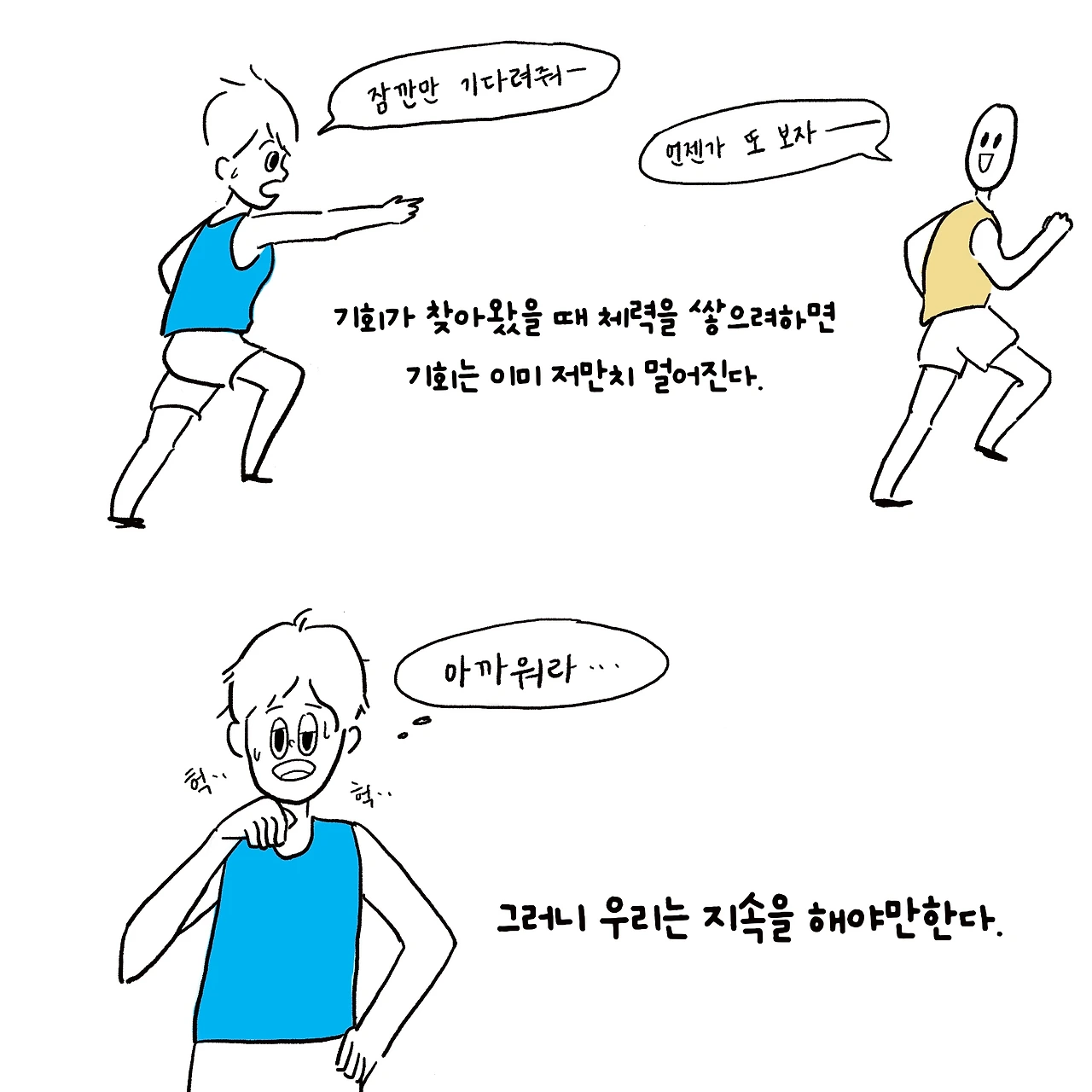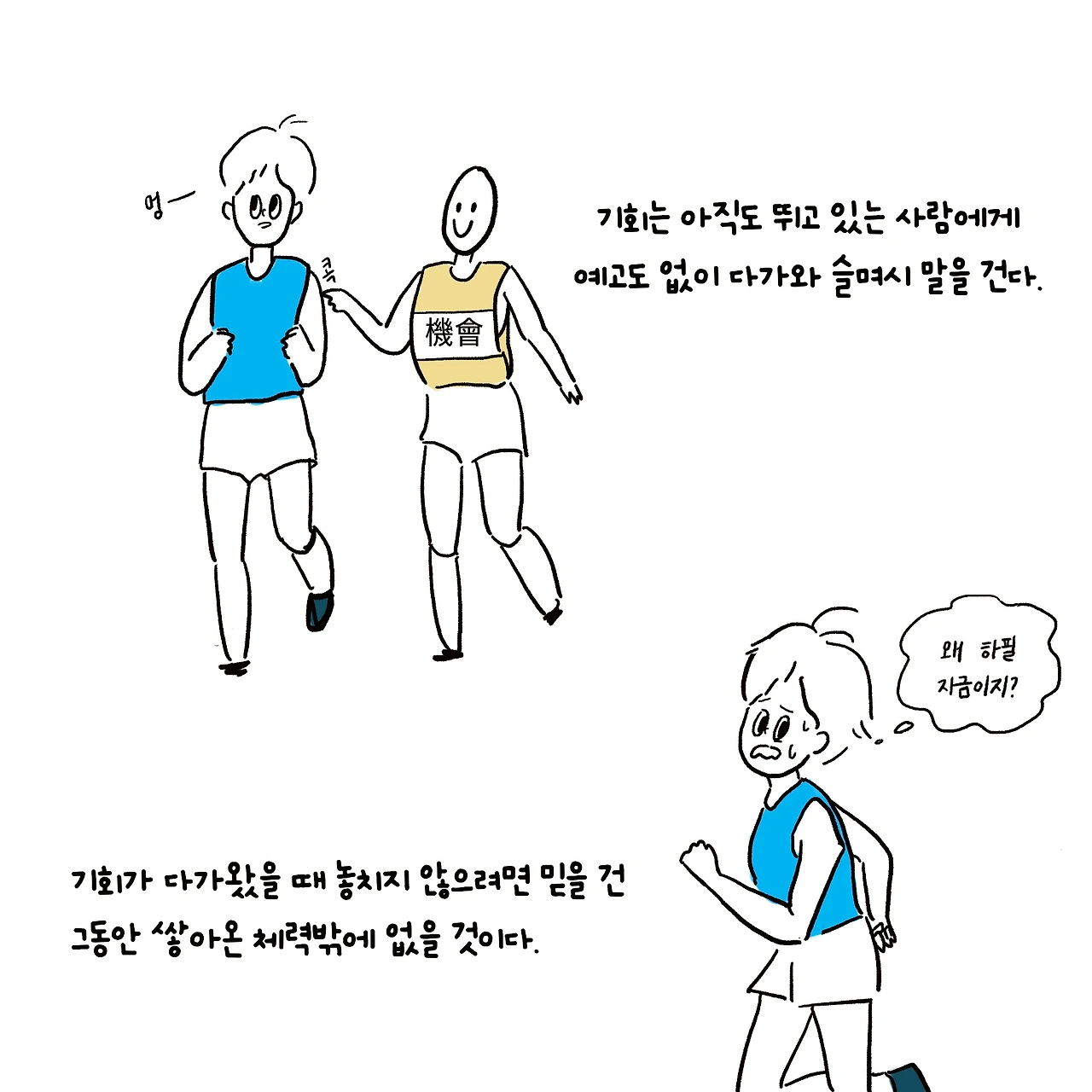 기회는 아직도 뛰고 있는 사람에게 예고도 없이 다가와 슬며시 말을 건다. 기회가 다가왔을 때 놓치지 않으려면 믿을 건 그동안 쌓아온 체력밖에 없을 것이다. 기회가 찾아왔을 때 체력을 쌓으려 하면 기회는 이미 저만치 멀어진다.