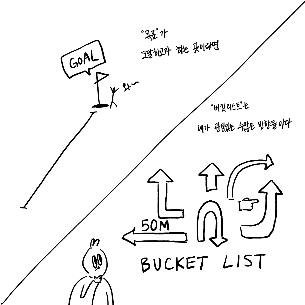 그에 비해 버킷리스트는 그저 내가 흥미가 생긴 무수한 방향들에 불과하다. 어차피 그 방향들을 지금 당장 모두 가볼 수는 없을 것이다. 흥미로운 방향들을 최대한 많이 써보고, 그중 가장 반짝거리는 방향을 집어 들고 나아가면 된다. 그러니 모든 방향을 도달하지 못할 까봐 겁내지 말고, 내가 원하는 방향을 최대한 많이 적어보기 바란다.