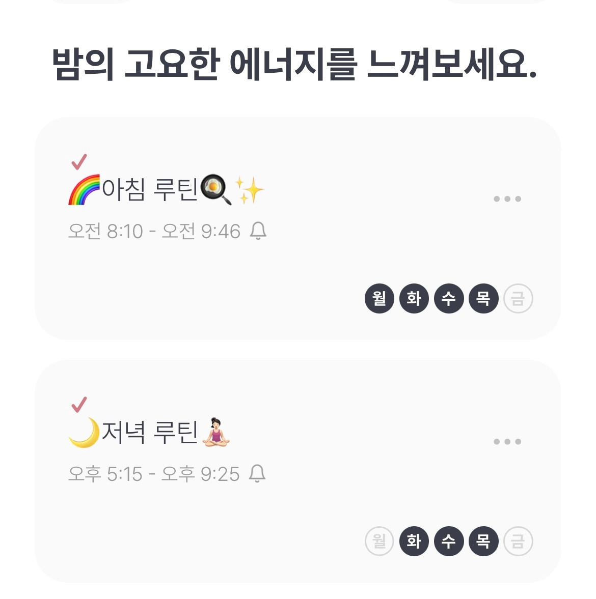 지금은 루틴 어플에 따라 몸을 움직이니(=내가 일일이 판단하지 않아도 되니) 정신적으로 훨씬 쾌적한 상태다. 그저 루틴을 시작할 시간이 되면 알람이 울리고, 호흡을 가다듬은 뒤 루틴만 시작하면 된다.