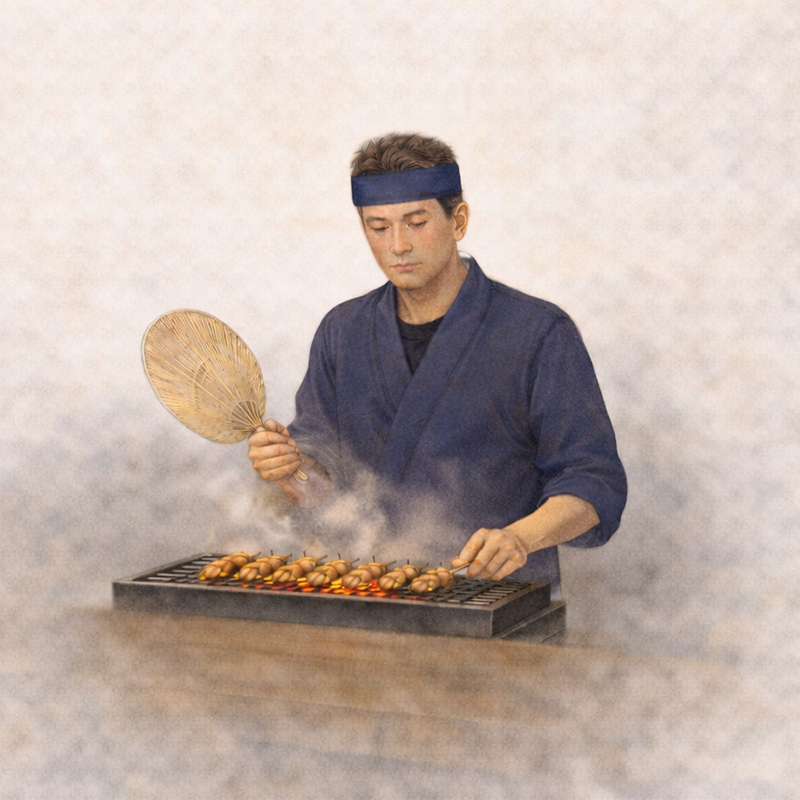 최근에 발견해 자주 찾는 식당이 있습니다. 저희 가게 정도 크기인데, 주방에 숯 그릴만 하나 두고서 온갖 재료를 구워 주는 곳이에요. 부채 하나 들고 땀 뻘뻘 흘리며 종일 굽고 있는 요리사. 가게에선 저도 조용한 편이지만 이 셰프님은 영업 중 말하시는 걸 들어 본 적이 없어요. 묵언 수행 중인 수도승의 모습이 저런 게 아닐까. 오늘 주문한 메뉴는 토종닭 소금구이. 베어 무는 순간, 그을린 껍질이 ‘츠즉’ 씹히고, 뒤를 이어 ‘팍’ 하고 터지는 닭다리살. 기가 막히네요!