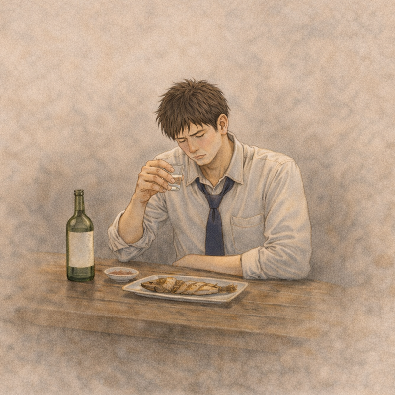 소주 한 병, 마지막 잔을 비우고 생선 뱃살 부분을 크게 한 젓가락 떼어 먹고 일어납니다.
