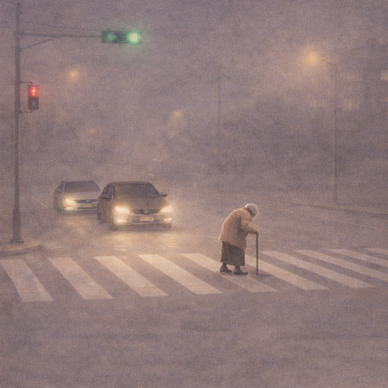 허리가 굽은 할머니 한 분이 느릿느릿 횡단보도를 건너고 있었습니다. 이미 빨간 신호로 바뀐 길을 할머니는 이제 절반쯤 건너고 있었습니다. 경적의 차량은 두 번째 차였어요. 할머니 걸음이 꽤 남은 상황에 약간 긴장이 되어 그 앞 차량의 운전석을 보았습니다. 고요한 새벽 교차로, 가만히 앉아 있던 청년. 좋아하는 음악을 듣는지 고개로 리듬을 타고 있었습니다. 할머니가 완전히 길을 건너는 동안 그 차는 움직이지 않았습니다. 그리고 할머니가 제 옆을 지나갈 때쯤 "딸깍딸깍" 비상등을 켜면서 출발했습니다.