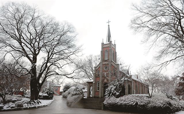 오후가 되었지만 눈은 멈출 줄 몰랐다. 퇴근 시간 정체을 염려하면서 서둘러 퇴근을 했다. 어렵게 버스에 올랐지만, 도로 사정으로 우회한다는 기사의 안내가 있었다. 이럴 바에냐 걷는 편이 낫겠다 싶어 버스에서 내렸다. 우산을 쓰고 골목길을 종종걸음으로 걷다보니 계림동 성당이 보였다. 아비규환인 거리와 달리 성당은 하얀 이불처럼 덮 것처럼 평화로운 모습이었다.