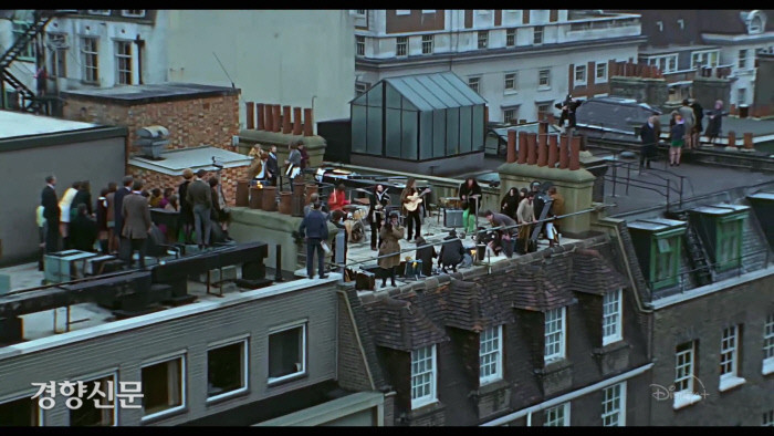 < Get back > 영화의 하이라이트는 애플 본사 옥상에서 벌어진 공연이다. 흔히 루프탑 공연으로 불리는 이 장면은 비틀스의 마지막 공연이자 해체의 전주곡이었다. 이날의 옥상 공연은 정월 찬 바람 속에서 게릴라 콘서트 형식으로 시작되었다. 느닷없는 비틀스의 공연에 행인들은 어리둥절했고 신기하듯 옥상을 올려다보고 있었다. 이날 공연은 허가된 것이 아닌 탓에 신고를 받은 경찰이 공연 전원을 뽑음으로써 마치게 된다.