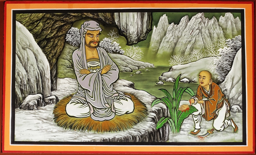 삼보사찰 송광사 대웅전에는 강렬한 벽화 한 폭이 있다. 그 벽화는 ‘혜가단비(慧可斷臂)’라불리는 불화인데 배움에 대한 절실함을 잘 나타내고 있다. ...하얀 눈이 내리는 조계산 동굴 앞에서 청년 혜가는 서역에서 온 달마에게 배움을 청하며, 그 결의로 자신의 팔을 잘라 버린다. 그 팔에서 뿜어져 나온 선혈이 하얀 눈을 붉게 적신다.