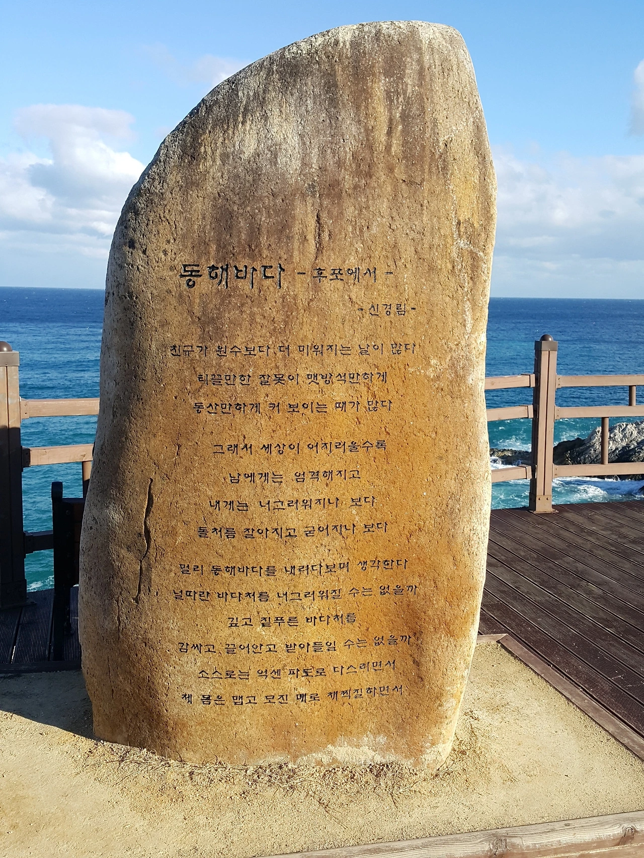타인에게는 엄하면서도 자신에게 너그러운 합리화. 어쩔 수 없는 중생심이다. 내 중심이라는 원심력을 뿌리치기란 쉬운 일이 아니다. <동해바다, 후포>에서 화자는 너른 동해를 응시하고 있다. 푸른 창해에 자신을 비추 보는 것이다. 세숫대야처럼 품이 좁은 내가 머리를 들고서 망망대해를 바라본다. 내면의 관조는 참회로 가는 길이다. 화자의 눈은 모든 것을 받아들이는 바다를 명상하듯 바라본다.