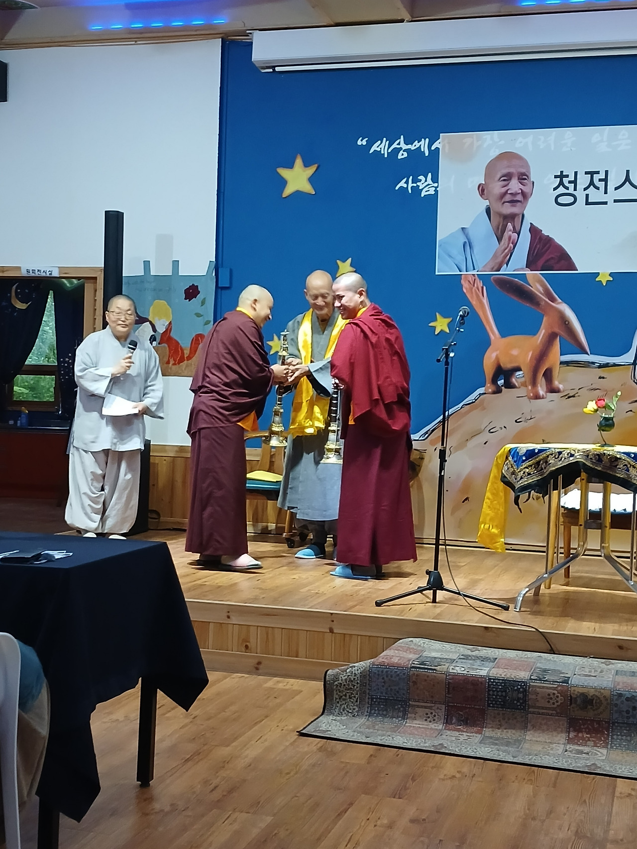 빗소리가 정적을 채우는 어린왕자 선문학관에 들어선다. 무대에는 청전스님 초청 테플스테이라는 플래카드가 걸려있다. 행사 시작까지는 여유가 있어 선문학관 여러 공간을 둘러본다. 약국 형님 부부도 사이좋게 다니고 있다. 패티 페이지와 카펜터스 노래 선율이 잔잔하게 흐른다. 절집에서 듣는 추억의 팝 음악이 신선하다.