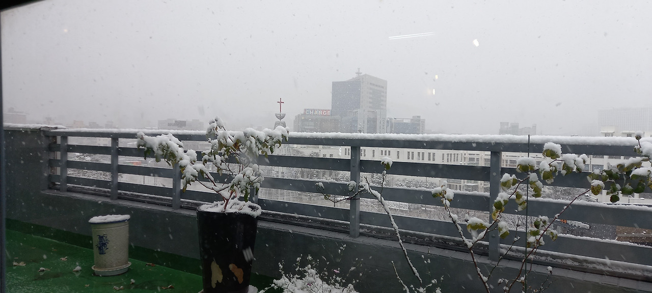 건물에 들어서자 우산을 접습니다. 눈이 우수수 떨어지네요. 설레이는 마음으로 승강기 6번 단추를 누릅니다. 베토벤 음악감상실 문을 열고 들어갑니다. 아~ 투명한 유리창과 빛바랜 의자와 탁자가 오래전 그대로입니다. 마치 젊은 날로 시간 이동을 한 것 같네요. 늘 익숙했던 창가 옆 테이블에 앉습니다. 내리는 눈 사이로 학 모양의 대학건물과 아시아문화전당이 보입니다. 수도원처럼 고요한 공간입니다.
