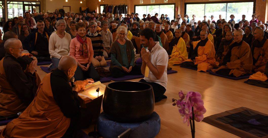 드디어 고대했던 법회 날이 되었다. 그날은 3월 27일 목요일이었다. 장소는 염주 실내체육관이었다. 설레이는 마음으로 이른 시간에 법회 장소에 갔다. 체육관에는 스님의 높은 명성 때문인지 많은 이들이 모였다. 법회의 시작을 알리는 종소리가 울리자 고요한 자비송이 흐르기 시작했다. 동시에 틱낫한 스님과 플럼빌리지 스님들이 연기처럼 입장했다.