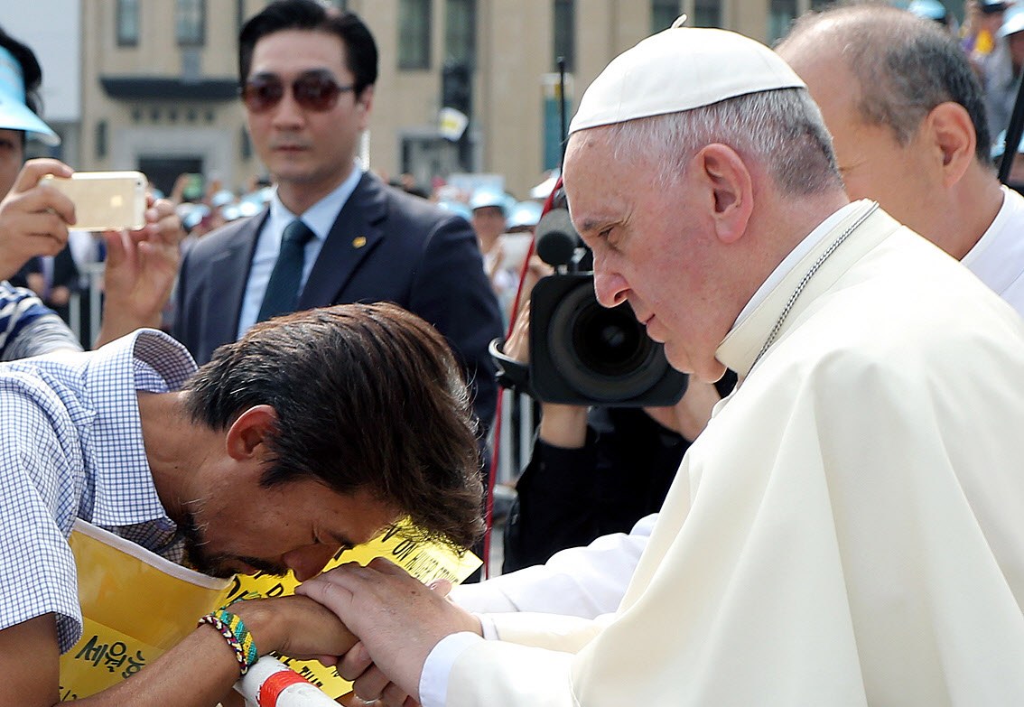 이번에는 베드로의 후계자인 교황의 얼굴을 제대로 보았다. 비록 시청 광장에 설치된 대형 화면을 통했지만 말이다. 뒷모습과 손톱 크기 정도로 볼 때와는 비할 수 없는 기쁨이었다. 대형 화면 속 교황을 태운 차량이 어디선가 멈추었다. 세월호 단식 천막 앞이었다. 차에서 내린 프란치스코 교황은, 단식 중이던 세월호 아버지의 손을 잡더니 뜨겁게 포옹했다. 눈물이 핑 돌았다. “와!”하는 소리와 “비바 파파”라는 함성이 하늘 높이 날아오르고 있었다.
