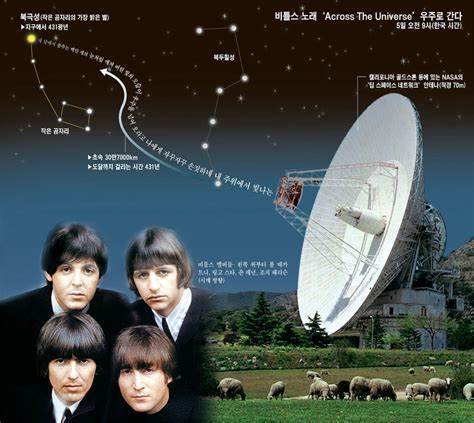 20세기 끝나기 직전, 비틀스의 노래<Across the universe>가 우주로 날아갔다. ‘NASA’ 창설 50주년 기념을 하기 위해서 미국과 스페인에 있는 3대의 초대형 전파망원경이 동시에 이 곡을 전송했다. <Across the universe>라는 제목처럼 우주를 가로지른 지구 최초의 음악이 된 것이다. 이 노래가 도착할 별은 놀랍게도 밤하늘의 중심 북극성이라고 한다. 서기 2439년이면 북극성에 도착할 예정이란다. 만약 그곳 외계인이 이 노래를 듣게 된다면 비틀스를 좋아하게 될지 궁금하다.