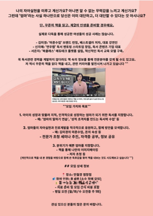 잠시 후, 첫 모임에 참여하기로 한 세 분의 어머니가 오셨다. 우리는 어색하게 마주 앉아 커피를 마시며 인사를 나눴다. 하지만 얼굴에는 다들 기대감이 엿보였다. 전단지를 보며 뭔가 새로운 도전을 해 보고 싶은 마음이 들어 신청했다고.