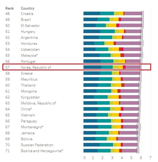 우리나라는 2023년도 행복지수가 전 세계 147위 중 57위로 그리스, 콜롬비아, 튀르키에 같은 최악의 경제위기나 재해를 겪은 나라를 제외하면 OECD 최하위권이라고 한다. 비슷한 순위의 나라들보다 1인당 GDP(파란색지표)나 평균기대수명(연두색지표)이 월등히 높음에도 이렇게 순위가 낮은 이유가 무엇일까?