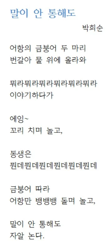 눌러서 크게 보세요. 박희순 시인의 동시집<바다가 튕겨낸 해님> 중 '말이 안 통해도'가 아이의 취향