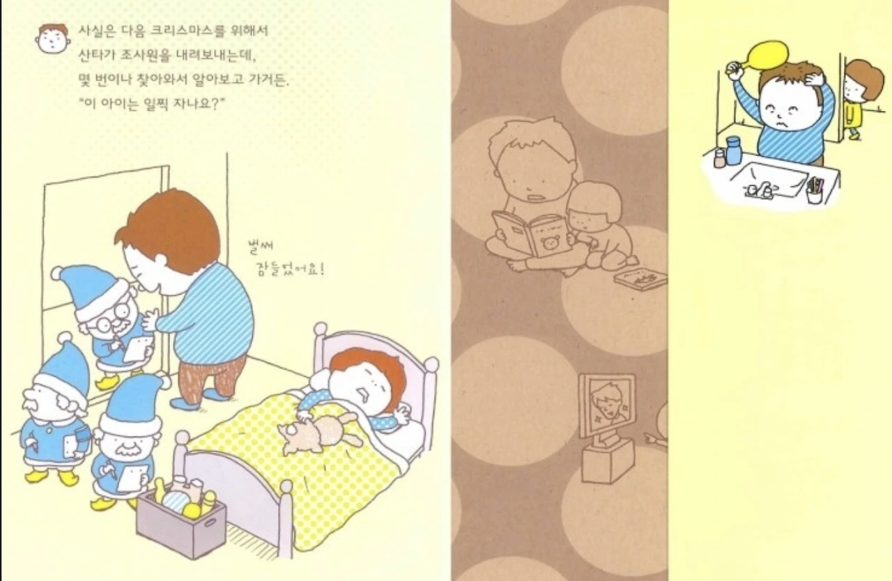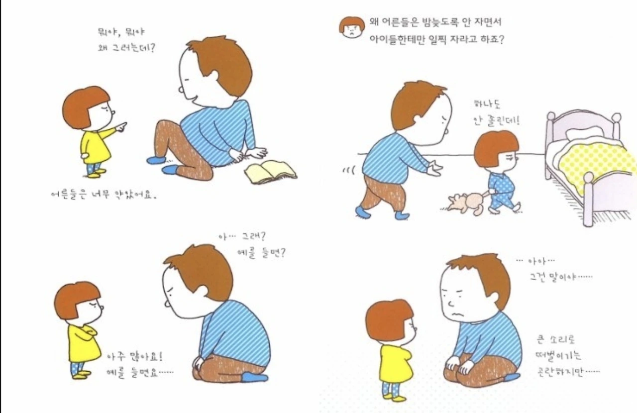 어른들은 밤늦게 자면서 왜 아이들은 일찍 자라고 하냐며 얌체 같은 어른에 대해 불만을 말하는 아이에게 눈 하나 깜빡 않고 능청스러운 대답을 하는 아빠는 동심을 지켜주는 건지, 어른들의 대변자인지 모호하지만 유쾌하고 재치가 넘친다. 아하! 아이한테 이렇게 대답하면 되는구나! 치트키를 얻은 느낌?