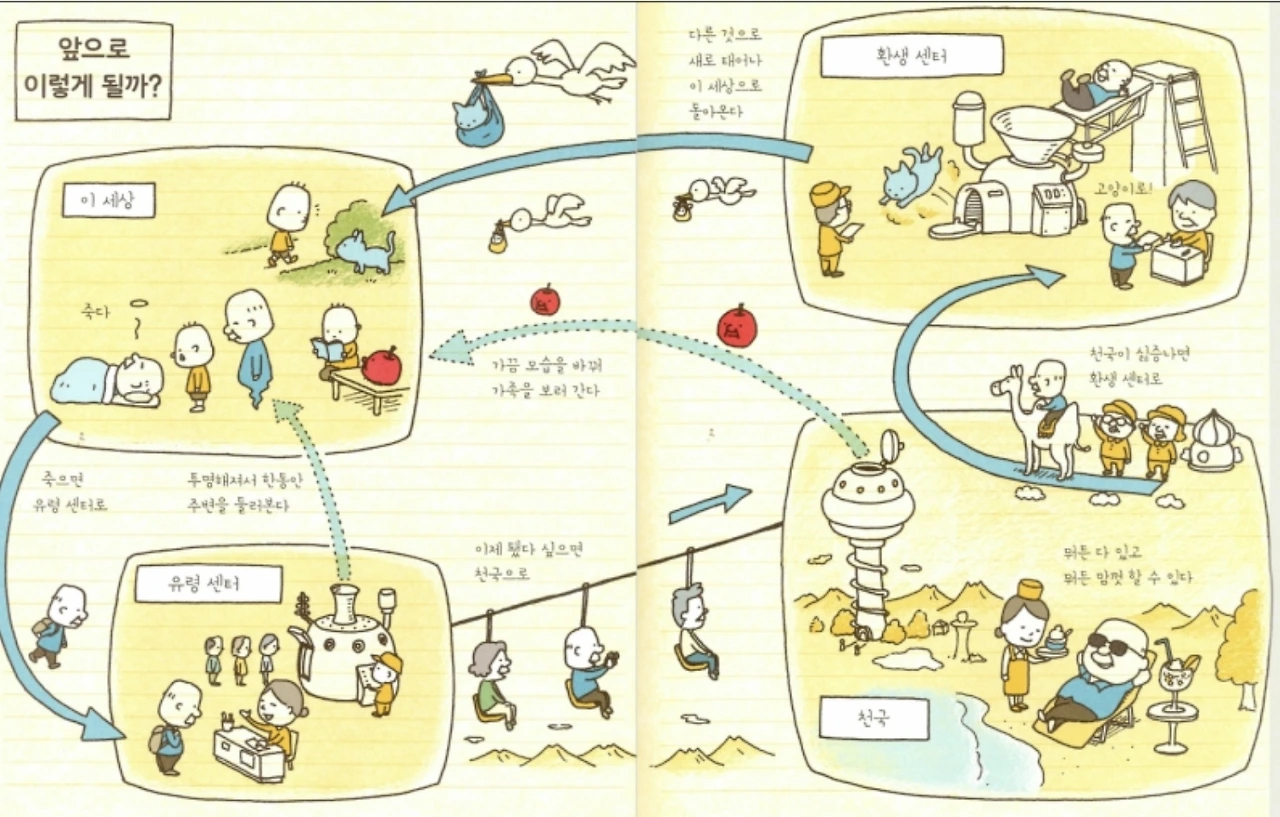 믿고 읽는 요시타케 신스케. 한 번 알게 되면 그 기발함에 멍~해진다. 매력에 빠져들 수밖에 없달까. 둥글둥글 단순한 캐릭터들이 글과 어우러지면 이야기 속으로 잡아끄는 것만 같다. 대충 그린 듯 정교하다. 군더더기 없이 간결하지만 말하고자 하는 내용을 딱 맞게 그려내는 건 재능이다. 어찌 보면 누구나 따라 그릴 것 같은 그림인데 어쩜 이렇게 역동적으로 살아있는 것 같을까?