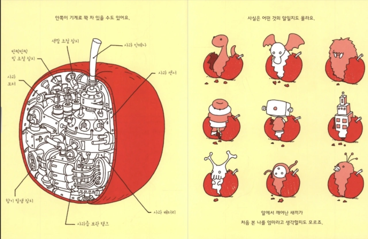 그의 책은 쉽다. 그리고 어렵다. 누구나 한 번쯤 해봤을 법한 상상이기도 하고, 혹은 이런 생각도 한다고? 깜짝 놀라기도 한다. 작가의 상상력을 따라잡는 건 쉽지 않아 보인다. 사과에 대한 생각들이거나 컵에 대한 생각이거나 혹은 죽음이나 나에 대해서도 고찰한다. 가볍지 않은 주제들마저 유쾌하고 기발해서 나이 고하를 막론하고 누구나 즐겁게 이야기 나눌 수 있게 만든다.