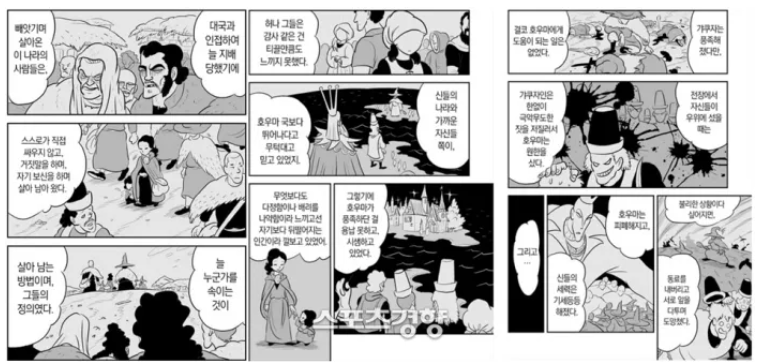 대충 지나가며 봐도 전체적인 내용이나 분위기가 한국과 일본을 비유하는 건 단박에 알아차릴 수 있다. 우정과 사랑을 말하며 감동을 주고 약한 것이 약하지만은 않다는 이야기를 전하는 작가가 한편으론 이런 생각을 하고 있다는 사실이 기함할 정도이나 이것이 일본의 현실이라는 생각도 든다. 일본인 대부분이 제대로 된 역사교육을 받지 못한 채 한국이 부당하게 일본을 싫어한다며 불편한 마음을 가진다고 한다. 그래서 일본 서점 한편엔 혐한도서들이 베스트셀러로서 당당히 한 자리를 차지하고 있다. 대다수의 사람들이 공감한다는 것이다.