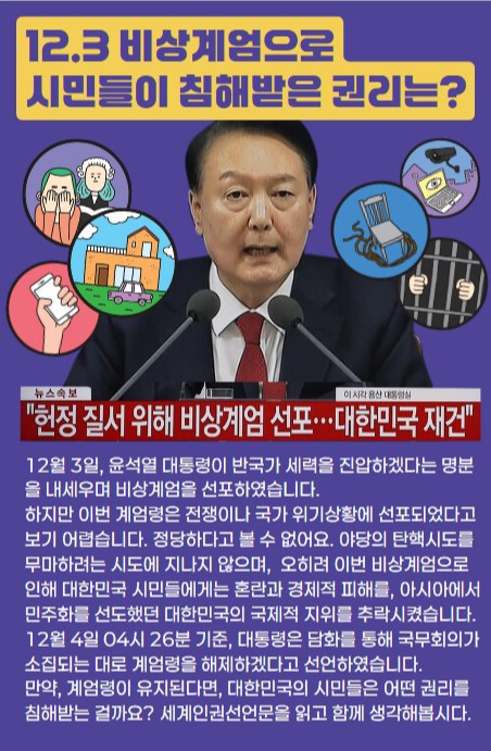 -북한 때문에 우리나라가 위험하다고. 그런데 사실은 나라가 위험한 게 아니라 대통령 마음에 안 드는 사람들이 있어서 그런 거 같아. 그래도 다행히 지금은 다 해제됐어.