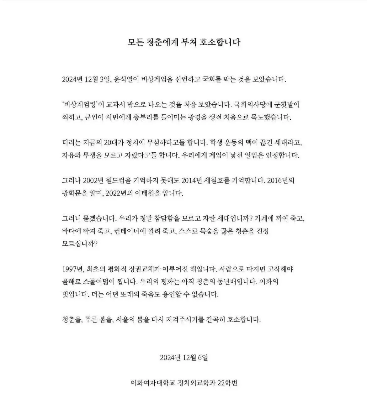 이대생이 낸 성명문을 봤다. 각 대학 학생들이 한마음으로 모여 비상계염사태를 규탄하고 시국선언이 이어지는 모습을 본다. 누가 이 세대더러 정치에 무심하고 항쟁의 시대를 모른다고 할까? 직접 계엄령을 겪은 세대로서 민주주의를 지켜가고 있음을 명징하게 보고 있다.