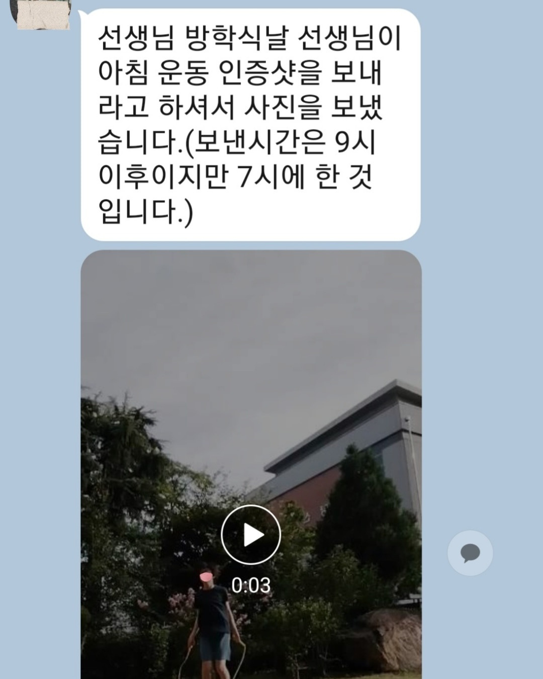 여름 방학 동안 아침 운동하고 인증숏을 찍어 보내라는 말을 들어주는 기특한 소녀도 있지요.