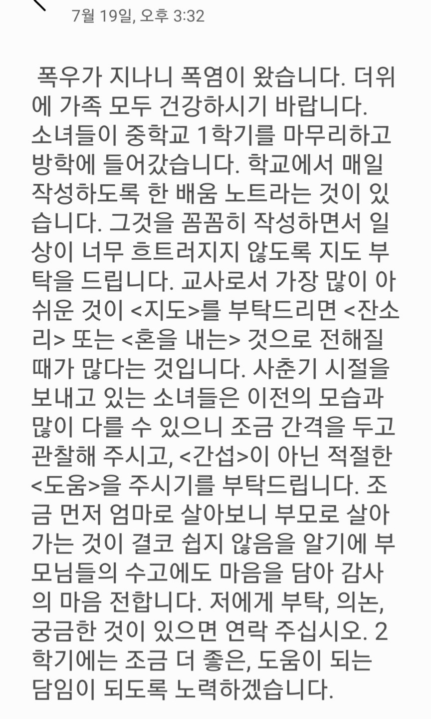 아이들과 잘 지내기 위해서는 학부모님들과도 소통이 필요하다고 생각하기에 이렇게 문자를 보내기도 합니다.